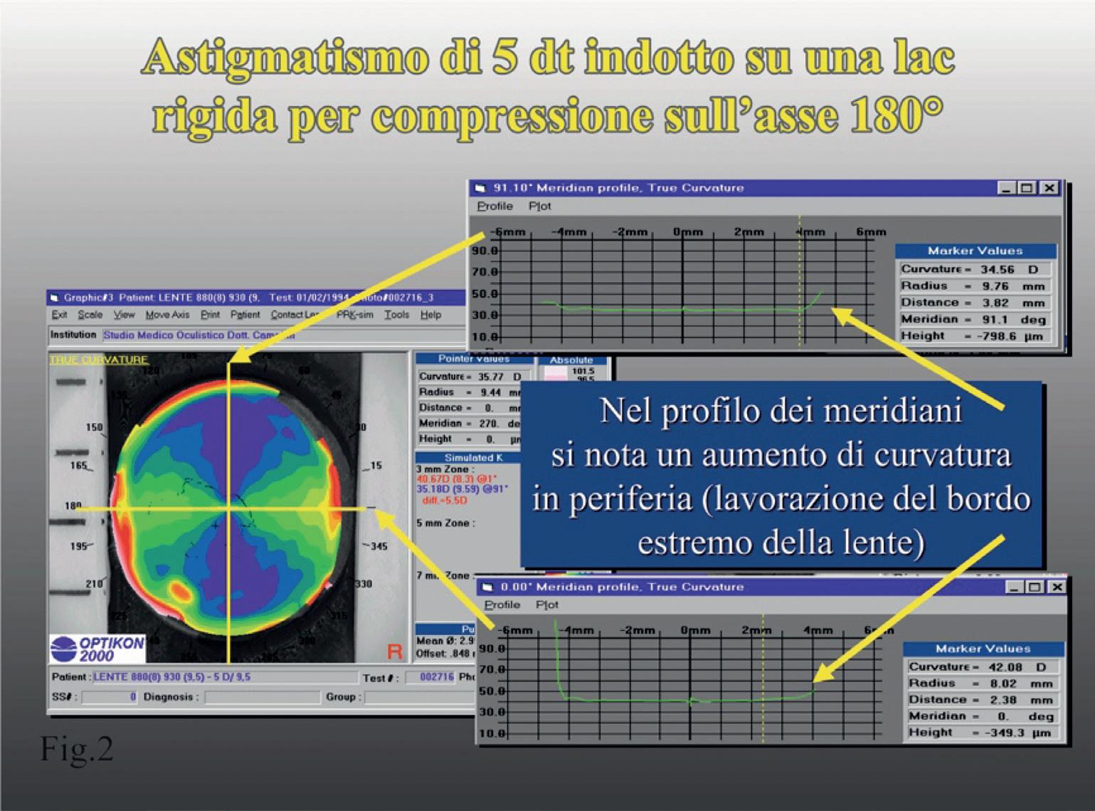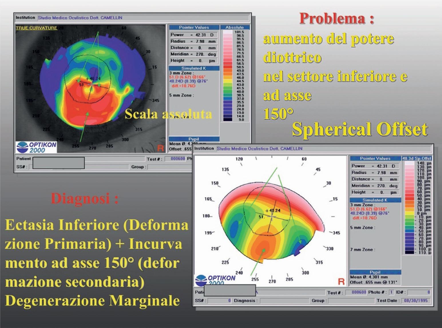 Questo è un vecchio intervento di correzione dell’astigmatismo effettuato con tecnica incisionale in media periferia (cheratotomie curve). Il progressivo sfiancamento delle incisioni è dovuto ad un cedimento strutturale e comporta un aumento di curvatura in media periferia (ad asse 270° nelle correzioni di astigmatismi secondo regola) con appiattimento verso il centro a partenza dalla media periferia ad asse 270°. Sull’ asse 180°/360° si assiste ad un incurvamento centrale (deformazione secondaria) raccordato allo sfiancamento inferiore (deformazione primaria).