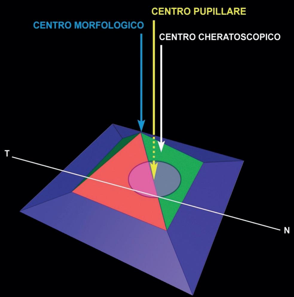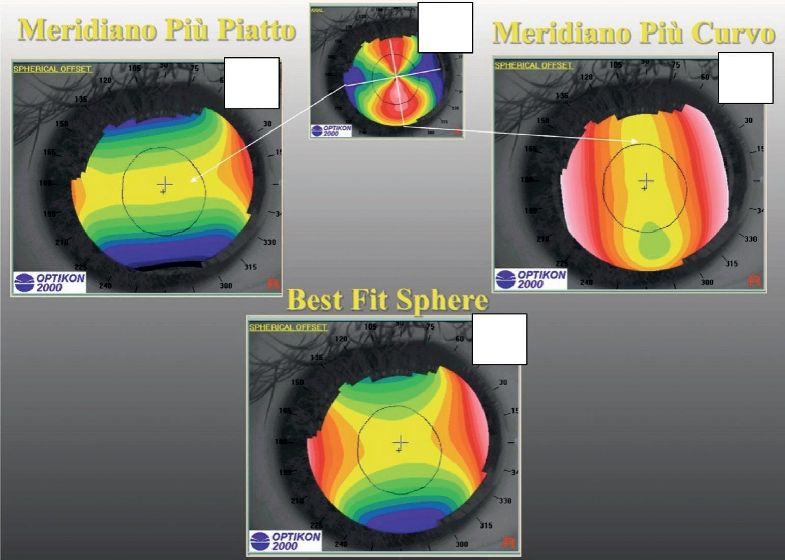 di riferimento, sono rappresentati in blu. La rappresentazione cromatica di un astigmatismo regolare con sfera di Best-Fit avrà quindi due poli verticali al di sotto della sfera (meridiano più curvo) e due orizzontali al di sopra (meridiano più piatto).