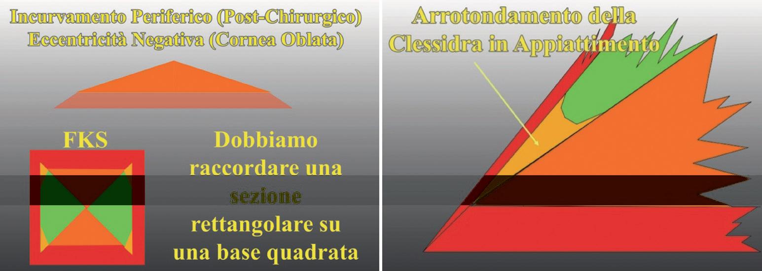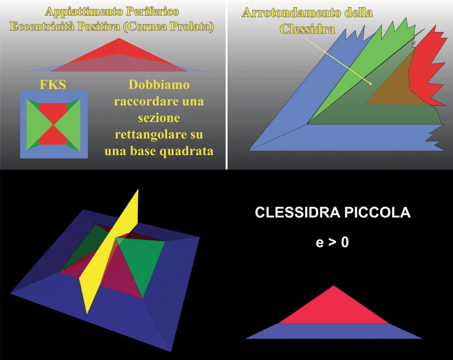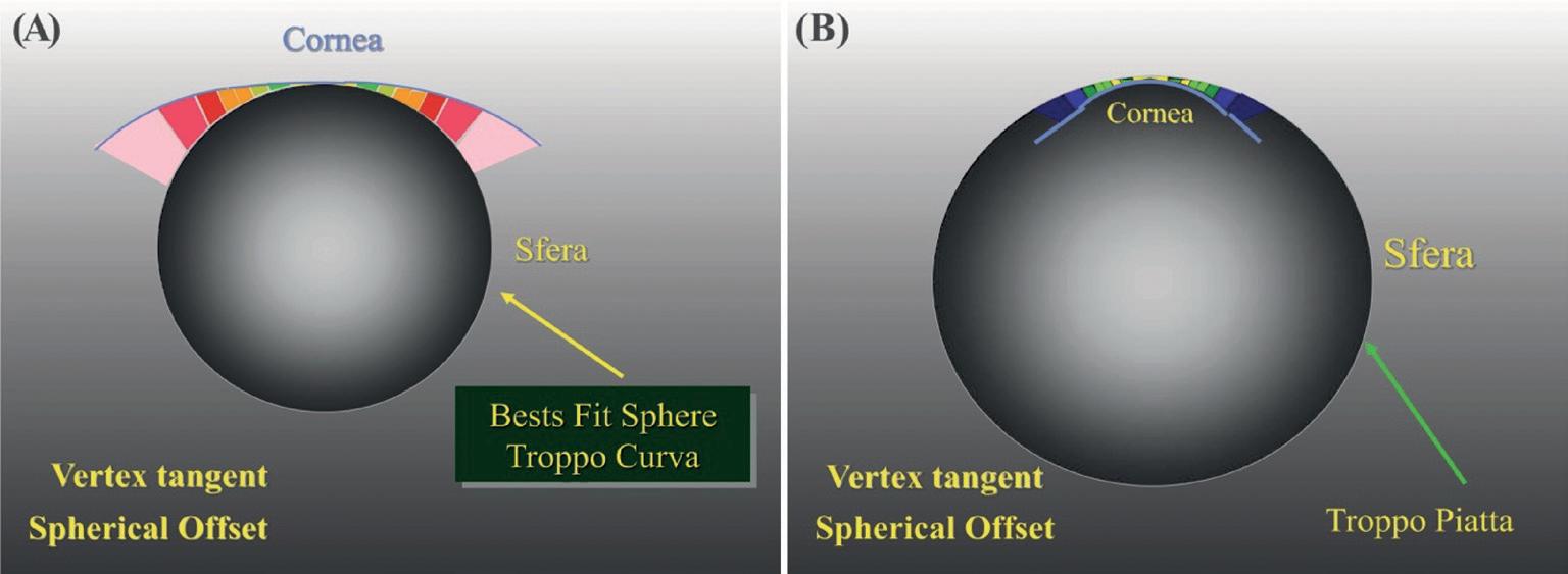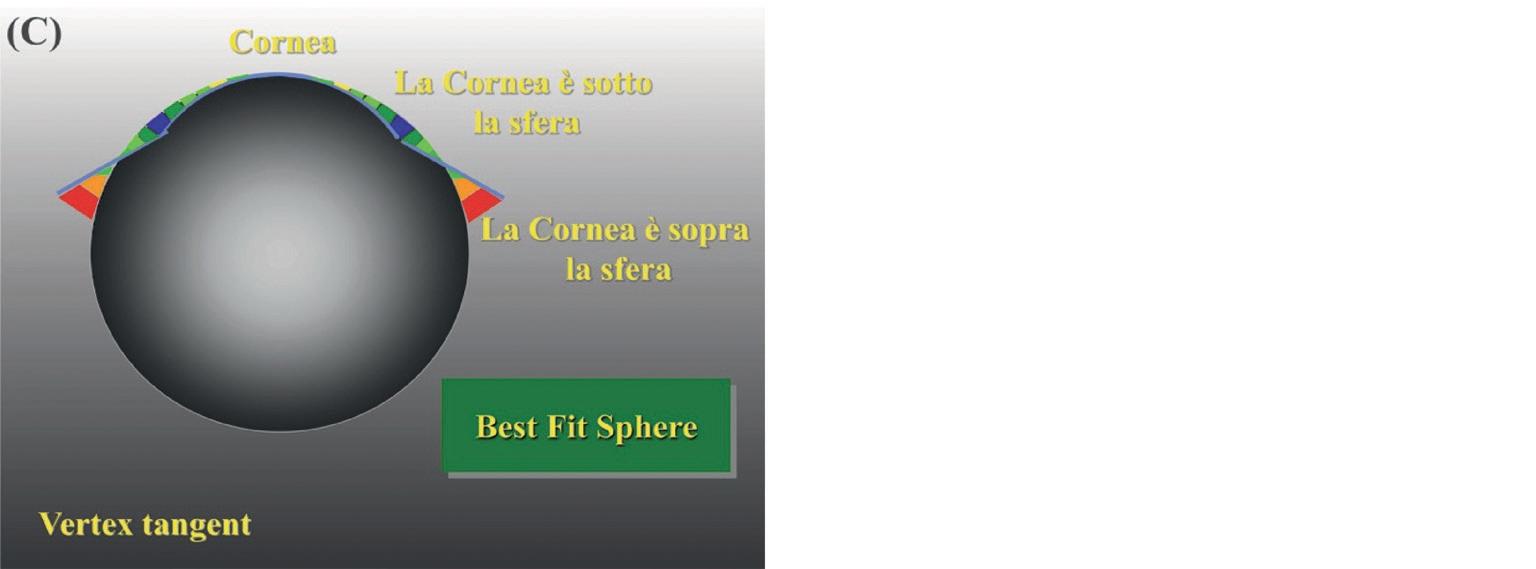 In figura 23 rappresentata schematicamente la ricerca della sfera di Best Fit con il metodo Vertex-tangent. In A la sfera è troppo curva rispetto alla superficie da analizzare, questa quindi risulta tutta al di sopra della sfera di riferimento; in B la sfera di riferimento è troppo piatta e la superficie da analizzare è tutta sotto alla sfera di riferimento. Quella mostrata in C è la sfera di Best-Fit, che meglio si adatta alla superficie da analizzare; alcune parti sono sopra ed altre sono sotto alla sfera di riferimento. È importante notare che nella rappresentazione cromatica dell’astigmatismo congenito con algoritmo altitudinale, il meridiano più curvo, in periferia, è rappresentato da due aree di colore freddo (con sfera di riferimento pari al meridiano più piatto). Esattamente il contrario di ciò che si può osservare nell’analisi con l’algoritmo assiale o tangenziale. Se la sfera con algoritmo altitudinale è pari al meridiano più curvo, ovviamente avremo colori caldi sul meridiano più piatto che risulterà sopra alla sfera di riferimento (Figura 24). Quindi quando i poli (meridiano più curvo) dell’astigmatismo sono al di sotto della sfera