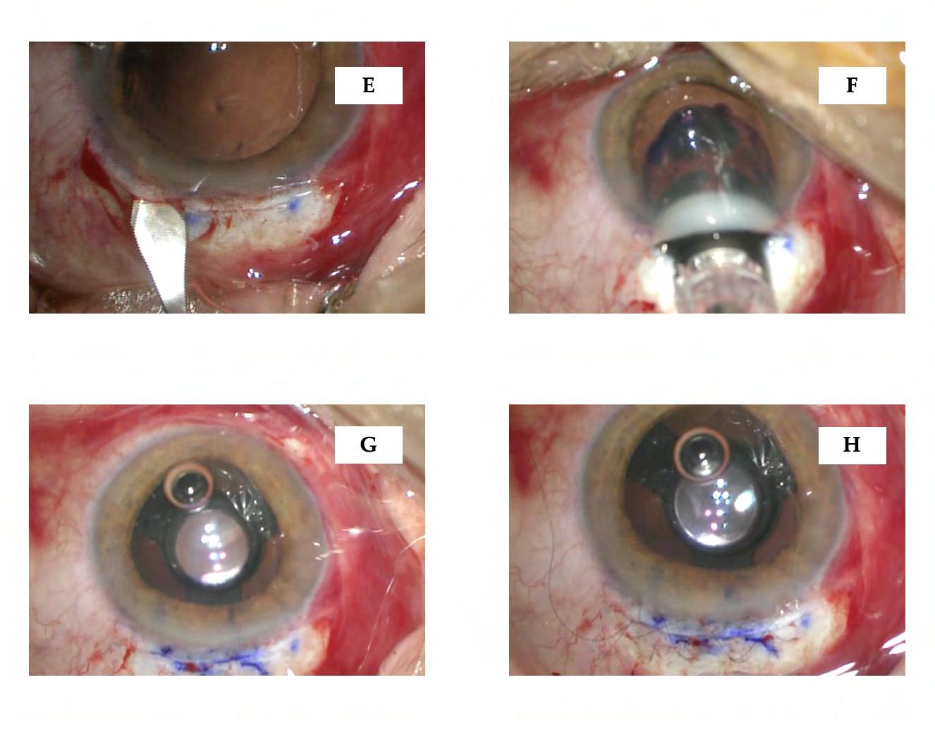 Figura 5. Fasi dell’impianto: allargamento del taglio sclerale (E); ingresso del cartridge caricato con il dispositivo: risulta fondamentale ai fini di una buona riuscita chirurgica che la punta dell’iniettore raggiunga il piano della capsuloressi (F); SING IMT nel sacco capsulare (G); sutura del taglio sclerale con Nylon 10-0 e controllo intraoperatorio dell’astigmatismo indotto con il cheratoscopio integrato nel microscopio operatorio (H).