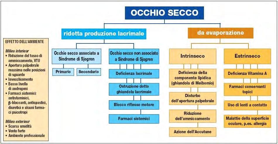 La forma iperevaporativa è la più frequente tra le forme di secchezza oculare ed è più frequentemente legato a una patologia a carico delle ghiandole di meibomio, che sono responsabili della secrezione del mebo. La fluidità del mebo è fondamentale nella costituzione dello strato lipidico del film lacrimale. La forma di secchezza oculare iposecretiva invece è più frequentemente legato alla sindrome di Sjogren. Le forme miste di secchezza oculare sono caratterizzati dalla combinazione di forma iposecretiva e for-