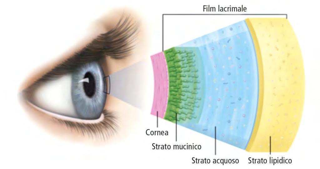 Il film lacrimale è una pellicola che riveste la superficie oculare ed è composto da tre strati: uno strato esterno (lipidico), uno strato intermedio (acquoso) e uno strato interno (mucinico). (Fig. 1)