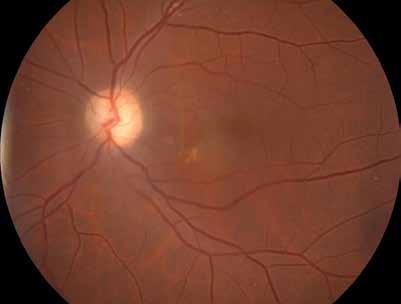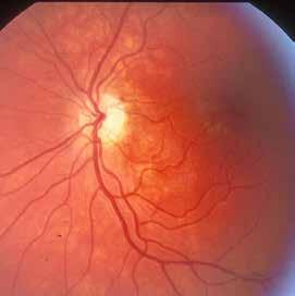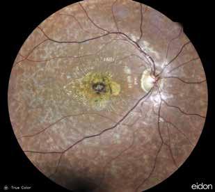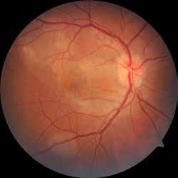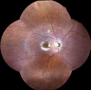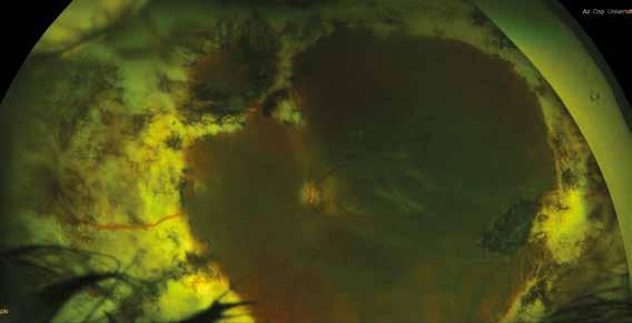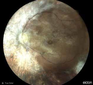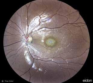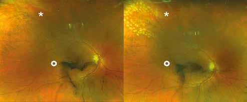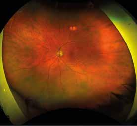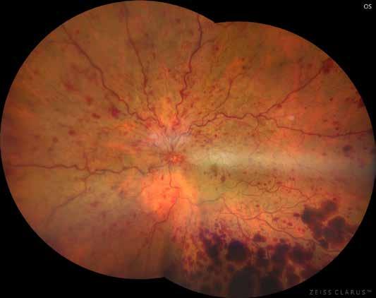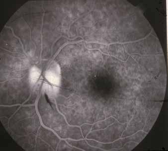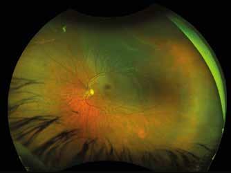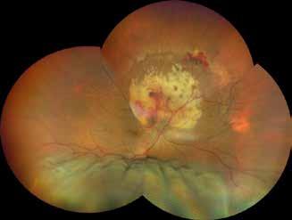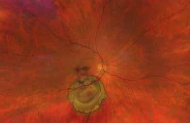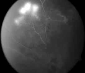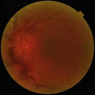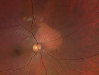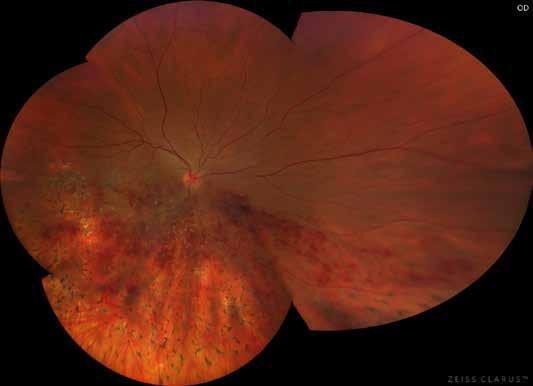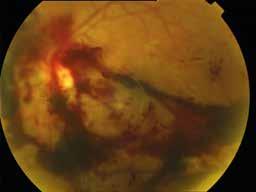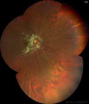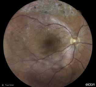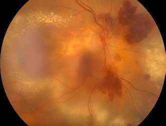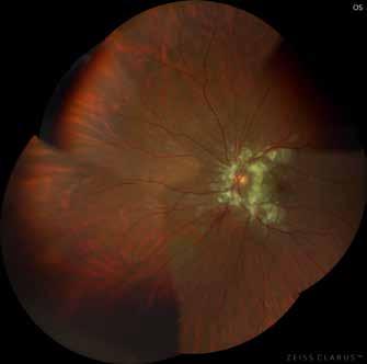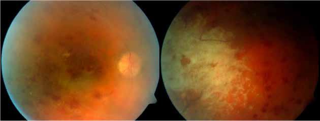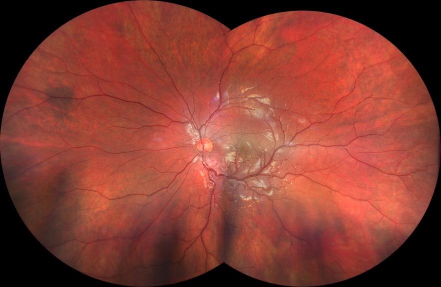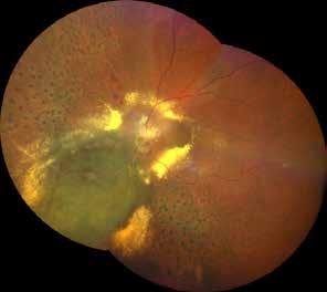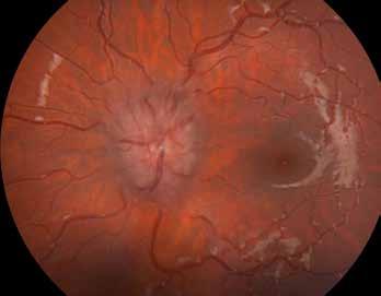 Figure 11. Color fundus photography showing a lasertreated radiation chorioretinopathy, characterized by chorioretinal atrophy, ischemia, ghost vessels, cotton wool spots, exudates and retinal hemorrhages; hemorrhages and exudates involve both the macular region (radiation maculopathy) and the optic nerve (radiation optic neuropathy)