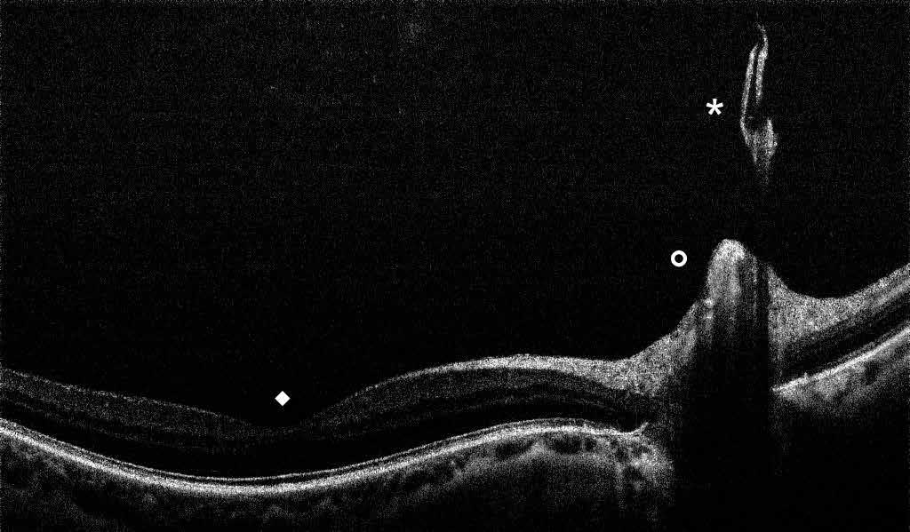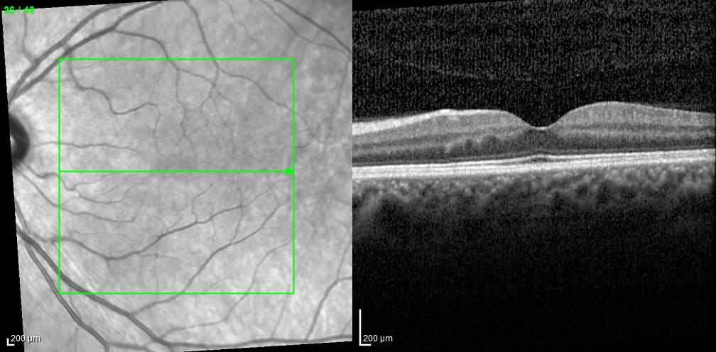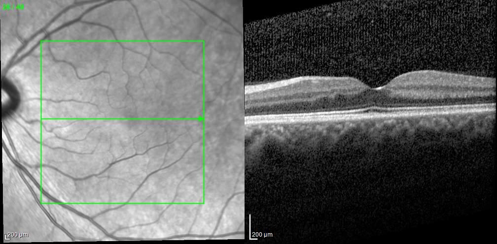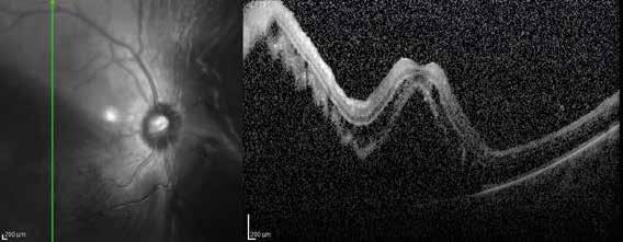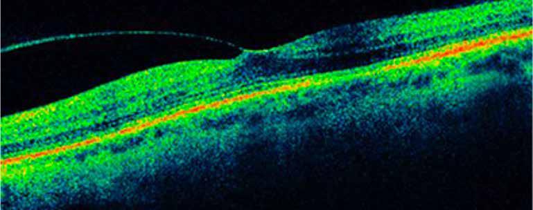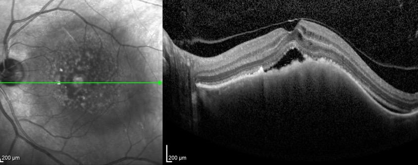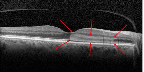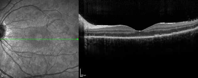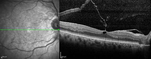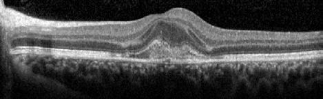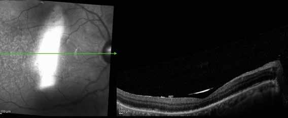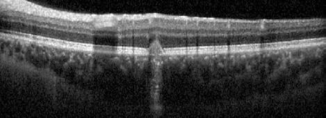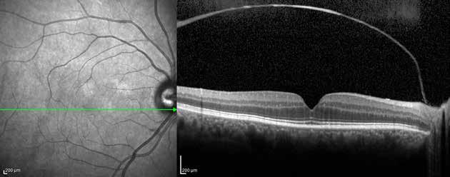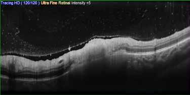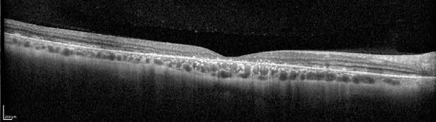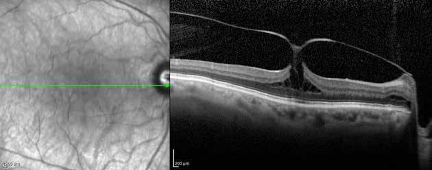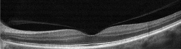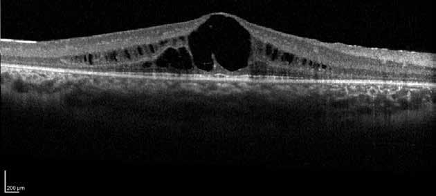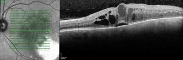 Figure 12. Macular optical coherence tomography showing cystoid macular edema with limited subfoveal neuroretinal detachment secondary to radiation maculopathy
