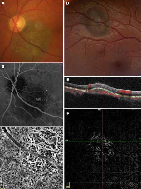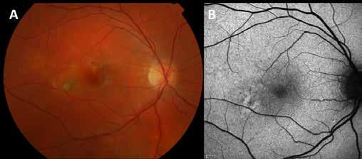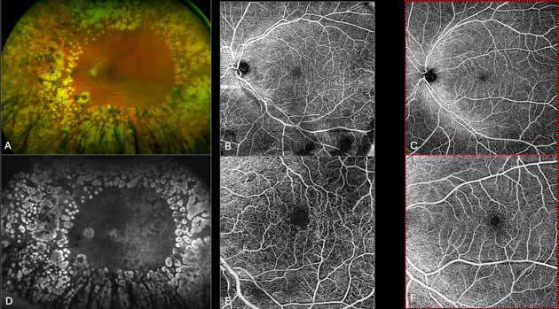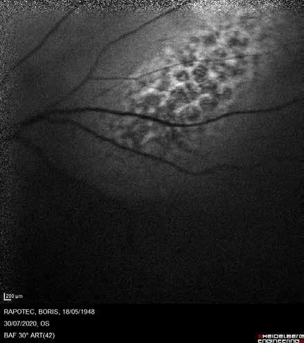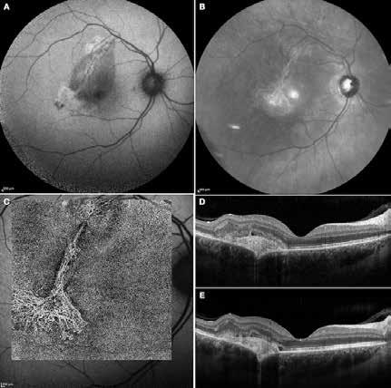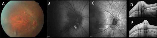 Figure 14. Color fundus photography (A) of astrocytic hamartomas. Blue-autofluorescence (B) shows hyperautofluorescent spots. Linear SD-OCT (C, D, E, shows hyperreflective thickening of the retinal nerve fiber layer RNFL with internal moth-eaten optical empty spaces and posterior dense optical shadowing.