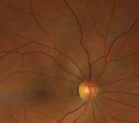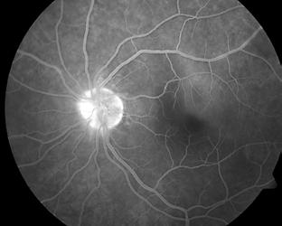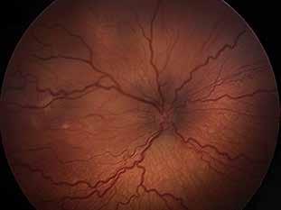 Melanocytomas are most common in patients with dark skin pigmentation; they occur slightly more often in females, and are usually detected in middle-aged patients. Melanocytomas are usually unilateral, although bilateral cases have been reported. They are generally asymptomatic, although in the case of extensive necrosis, a decrease in vision can occur. Retinal vascular alterations have been observed in 30%, subretinal fluid in 10%, and optic disc edema in 28% of cases. On long-term follow up, approximately 5% showed some deterioration of vision, 75% had an enlarged blind spot, 20% had arcuate scotomas, and 30% had an afferent pupil defect. The tumor borders may be sharp, but more commonly they are fibrillar due to infiltration of the nerve fiber layer. The average age at diagnosis was 50 years. Malignant transformation is extremely rare. Virtually all optic nerve melanocytomas can be observed without intervention. I have seen one case of malignant degeneration. In that case, the tumor was much larger than the typical melanocytoma, and a significant area of peripapillary choroid was also involved[4,12]. (Figure 16)