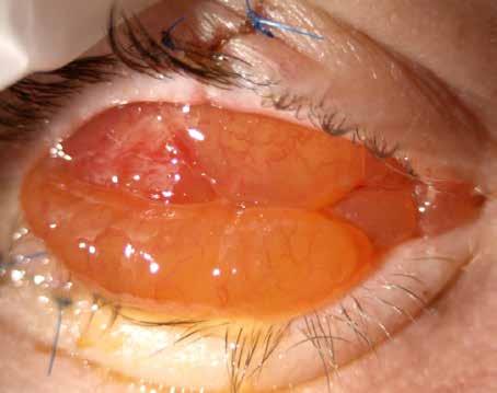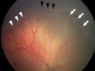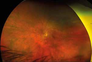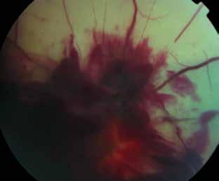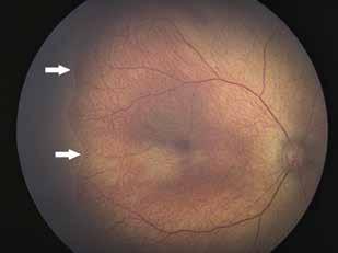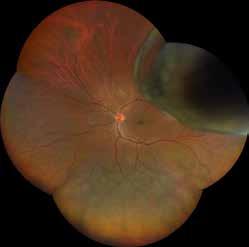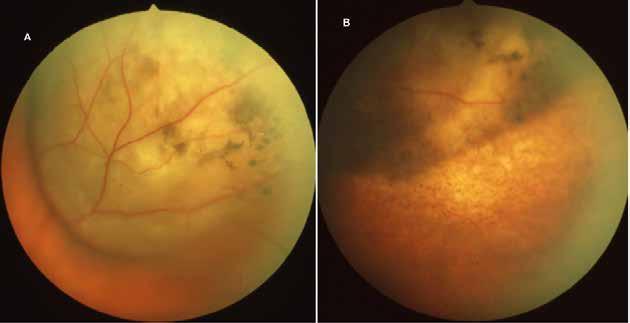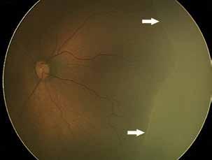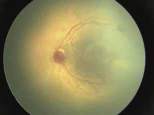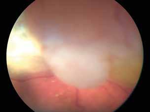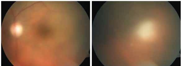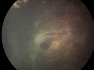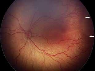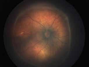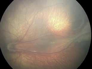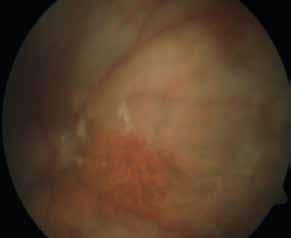 usually presents as a total retinal detachment. The subretinal exudate is yellowish, in contrast to the white or pink color seen in retinoblastoma[38]