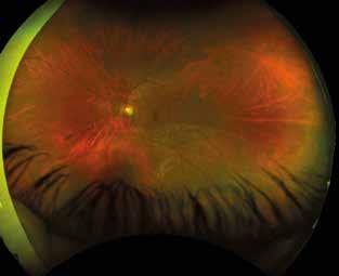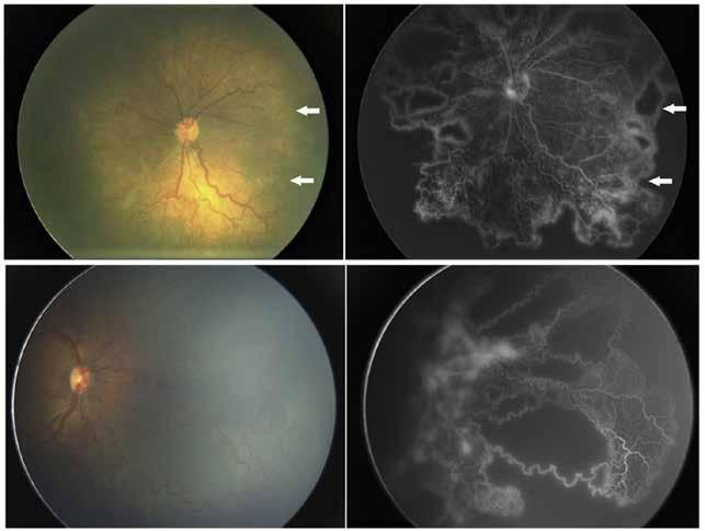In older patients, the first symptom in Coats’ syndrome is usually a decrease in vision or visual distortion due to macular exudation with peripheral telangiectasia. These cases are managed with photocoagulation or cryotherapy of the peripheral retinal telangiectasia. The resorption of subretinal exudate is very slow, and usually takes between 3 and 12 months after successful treatment. Rarely, after adequate treatment, new retinal telangiectases develop or become apparent in other areas of the peripheral fundus. Despite the rarity of recurrence, frequent examinations are necessary, and disease reactivation is observed even up to 5 years after successful treatment. Isolated cases of Coats’ syndrome in the macula have been reported in adults, but Coats’ syndrome usually does not fall within the differential diagnosis of ocular oncologic problems. Occasionally Coats’ syndrome occurs alongside other conditions, including retinitis pigmentosa and various systemic syndromes[4,38]. (Figure 15)
