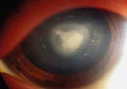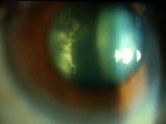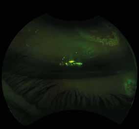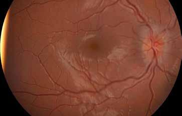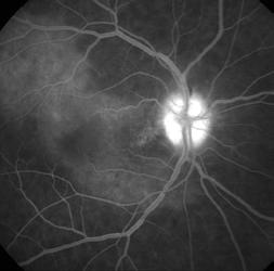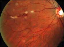 Approximately 70 patients with primary intraocular lymphoma have been reported. As a general rule, any patient over the age 50 with new onset bilateral diffuse uveitis should be suspected of having intraocular lymphoma, although the disease is more common in older patients. Approximately 85% of patients with intraocular lymphoma eventually develop CNS lymphoma involvement, but CNS disease can occur before, during, or after the development of ocular disease. Bilateral ocular involvement is present in over 85 % of cases, although about one-third of patients may initially present with involvement of only one eye. Vitreous cells are usually present, with relatively mild or minimal anterior chamber reaction. (Figure 17) The anterior chamber reaction can be granulomatous or non-granulomatous. The pathognomonic lesions are white-yellow chorioretinal infiltrates. (Figure 18)