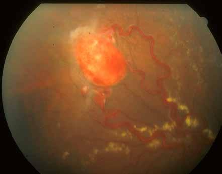 matogenous detachment is significant. Small lesions without these associated findings generally do well; large lesions, especially those on the disc, have a poor visual prognosis. New retinal angiomas can occur. Consequently, patients require lifelong serial evaluations. Mortality in this syndrome is usually due to CNS lesions or, less commonly, visceral malignancies.