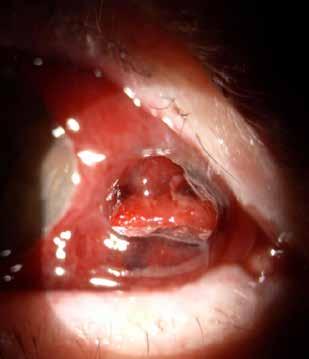 Enucleation is the recommended therapy for numerous uveal melanomas. It should be used in patients who, after giving informed consent, request the removal of the eye. It is also optimal for patients whose melanoma involves more than 40% of the ocular volume or over 50% of the ocular circumference. Moreover, if the melanoma is associated with significant neovascularization or the eye is blind, enucleation should be performed[4]. The surgical procedure implies performing a 360° limbal peritomy. The quadrants are gently opened to isolate the muscles. The four rectus muscles are isolated and detached. Enucleation scissors are placed in the medial orbit; the blades are positioned around the optic nerve, which is severed. After enucleation, the eye should be carefully examined in the operating room. Once hemostasis is achieved, an implant is placed in the orbit. The largest implant size compatible with the patient’s orbital anatomy is used; in adults, a 20 or 22 mm sphere is inserted. After suturing the muscles and placing the sphere in the orbit, Tenon’s capsule and the conjunctiva are closed. A conformer is placed in the eye socket[4]
