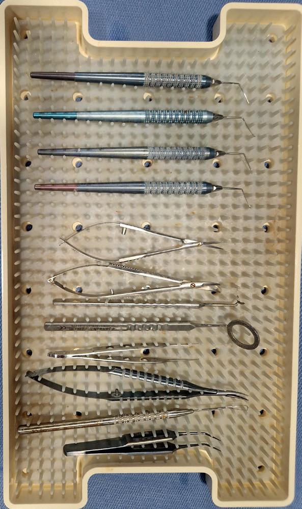Altro argomento che aiuta a condurre una serena seduta chirurgica è lo strumentario di base. Nelle estremizzazioni recentemente acquisite, tutto è contenuto in un custom pack monouso, comprese pinze per capsuloressi e blefarostato. In effetti, la mia spasetta base per cataratta contiene sette strumenti, quindi pochi, ma essendo tutte uguali, gli infermieri che le