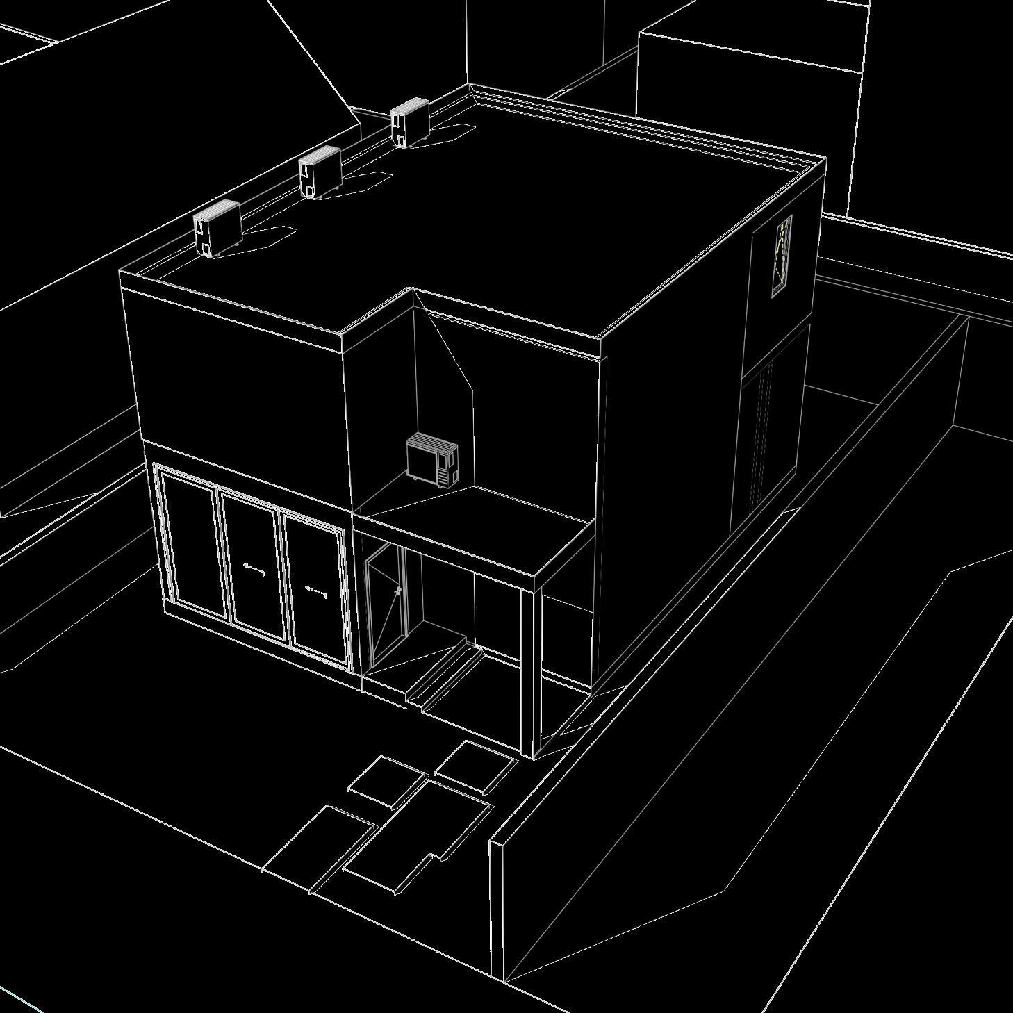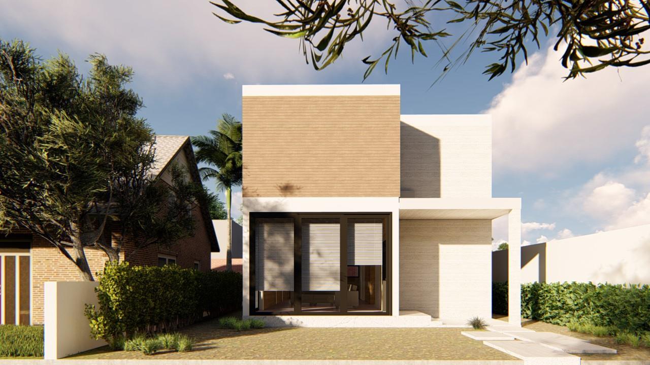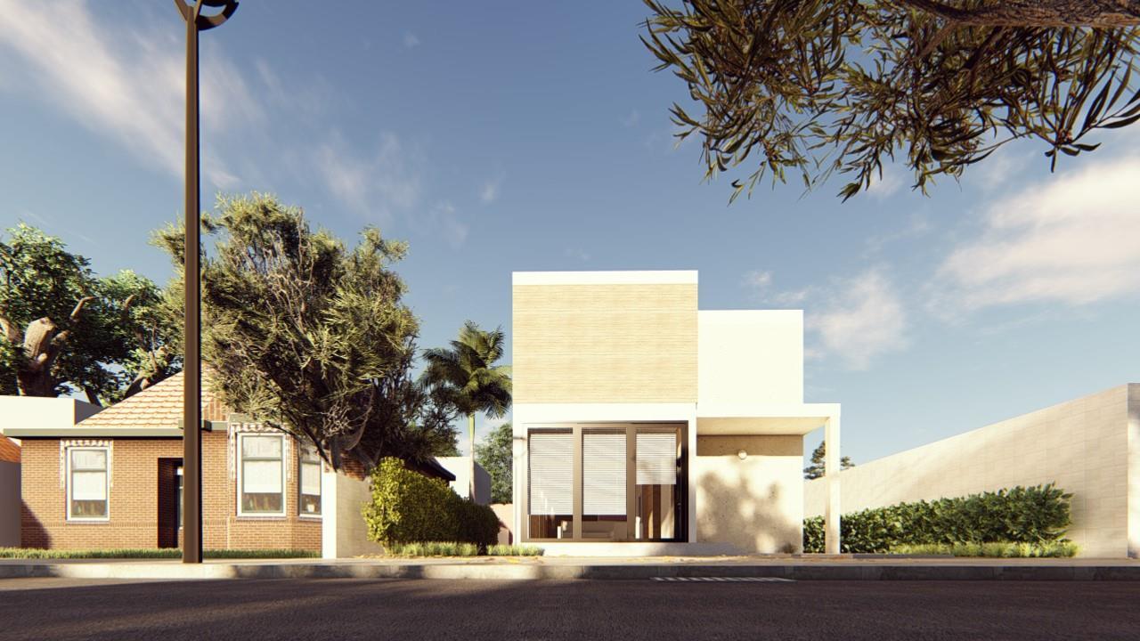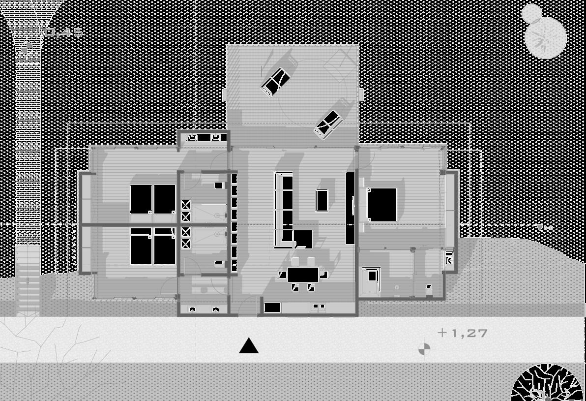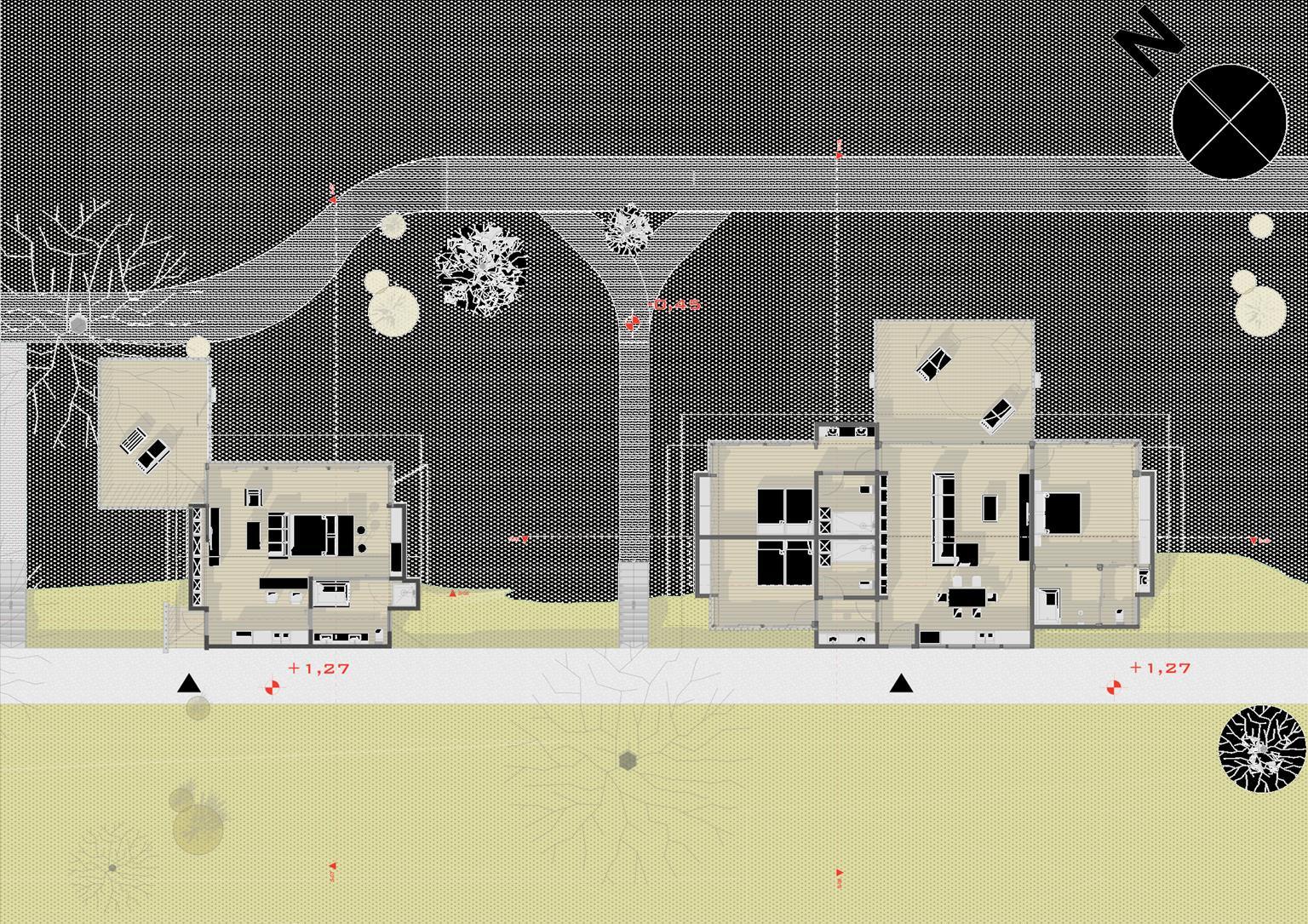 The implantation of the building with a volume fits perfectly in the 7 5 x 10 m plot Contains one Access to , A Common Room (Living and Dining), A kitchen and service areas