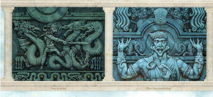 The heroes illustrated throughout this introduction are examples of heroic archetypes. The General, the Protector, the Vanquisher, the Hunter, the Provider, the Warrior, the Slayer, the Philosopher, and others like them are idealized figures who appear in narrative and theatrical drama-sometimes with personal names attached, but often without. Tales describe the Slayer destroying a hydra ... and a mighty cyclops, and a dragon, and a Nyxborn giant, and a lamia, and any number of other creatures. Did one Slayer do all that? No, the archetype has become the repository for legends about many different heroes, all of whom are notable primarily for slaying something.