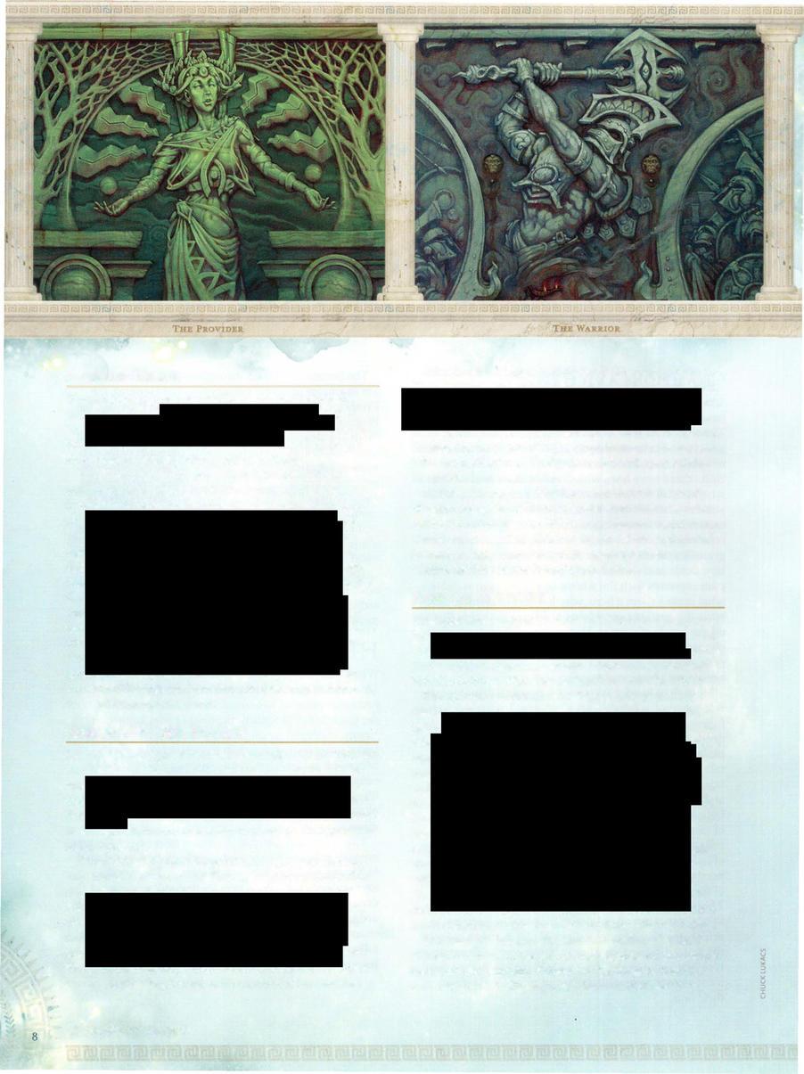 Chapter 3 turns to the mortal world, the lands in which the epic adventures of Theros unfold. It covers the three city-states of humanity, the wild lands of leonin and minotaurs, the great forests and wide plains where satyrs revel and centaurs roam, and the seas where tritons dwell and titanic monsters lurk. It also offers glimpses into the divine realm of Nyx and the dismal realms of the Underworld.