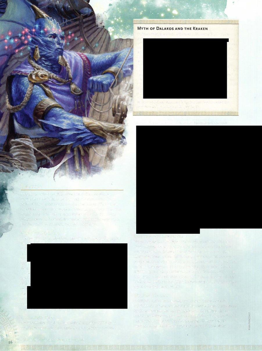 Yetthe kraken carried on, movingtoward a coastal human settlement. Amid the ruins ofhis home, Dalakos had a revelation. Working desperately, the triton crafted a miraculous device, onethat ultimately laid low the kraken and saved the town. Today, Dalakos resides inside the kraken's shell, where he works day and night, his heart broken, but his mind for-