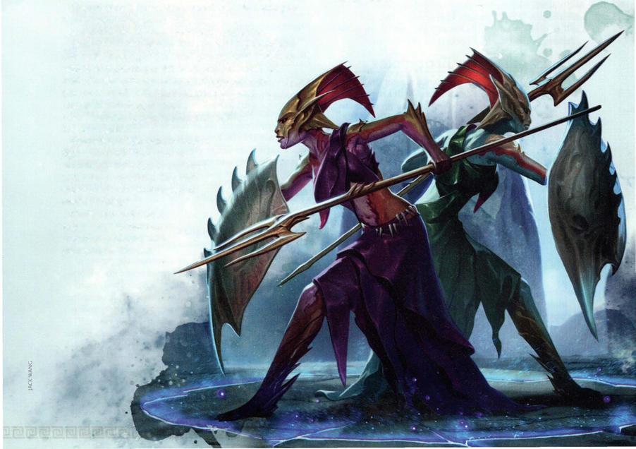 Tritons dwell throughout the Siren Sea, exploring a world of coral forests and secret mountains the "dryfolk" of the surface world will never know. While most live their entire lives beneath the sea, they're not bound to the deep. Following their inherent curiosity, some tritons venture beyond the waves, seeking to explore a whole world ofwonders beyond their own.