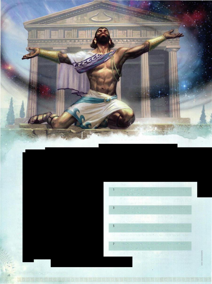 Chapter 2 introduces the gods of Theros, a squabbling pantheon of arrogant and powerful beings who view mortals as pawns in their strategic games. It also provides rules and guidelines for characters who serve as champions of the gods, including divine benefits they can gain as rewards for their piety.