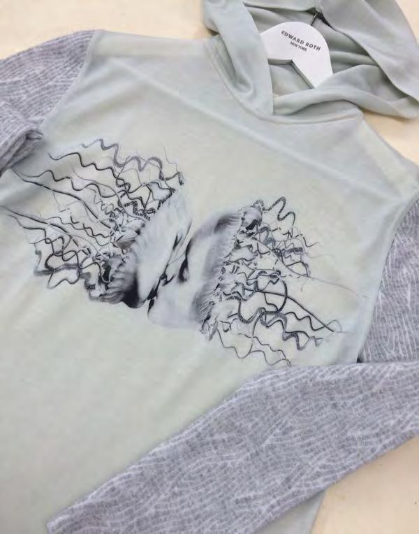 • Custom printed cashmere sweaters: the goal was to achieve a resistant and vibrant multicolor print on 100% Cashmere sweaters. Our contractor was able to perfectionate a technique to whiten the material without damaging the hand and stabilizing at the same time the inks. The sweater on the left has been finished with jacquard circular knitted sleeves.
