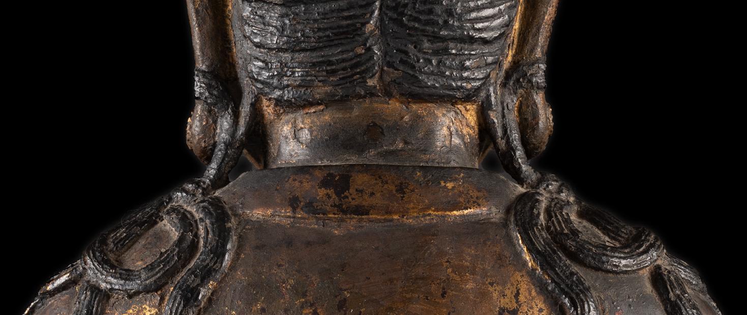 The clear Chinese features visible in the present bronze — especially in the facial modelling — are characteristic of the midGoryeo period6. In particular, the sinuous locks falling over the shoulders are a distinctive sign of Song (960–1279) influence upon mid-Goryeo sculpture7. This influence is readily appreciated in comparison with a Chinese wooden sculpture of the Southern Song dynasty (1126–1279) representing Avalokiteśvara, now preserved at Sennyūji temple8, Japan. The subject, pose and facial expression — half-closed eyes, hair laid over the shoulders, moustache and beard painted and a conspicuous necklace on the chest — correspond closely. These parallels, together with the documented maritime transmission of iconographic types, indicate that Goryeo ateliers reworked Song prototypes into sculpted and cast forms suited to regional circulation, particularly in the case of images of Avalokiteśvara9 .