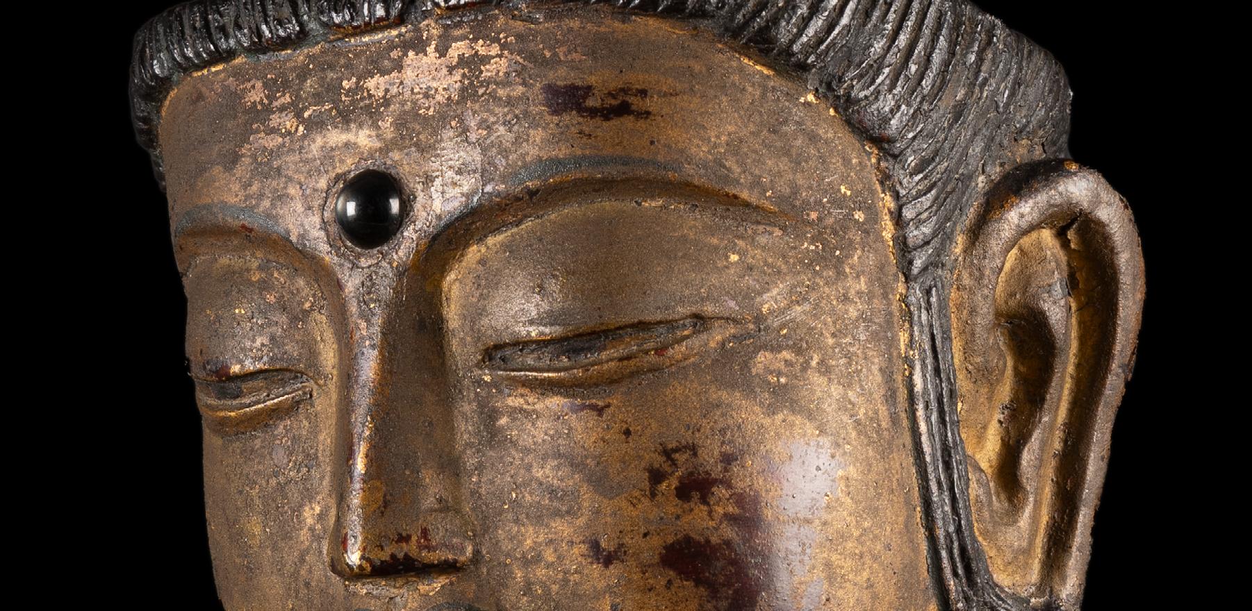 Long lacquered-black locks fall in waves over the shoulders and are gathered into a chignon at the crown. The serene face is distinguished by a painted moustache and beard and by half-closed eyes with visible pupils. An ūrṇā inlaid with rock crystal is set at the centre of the forehead.