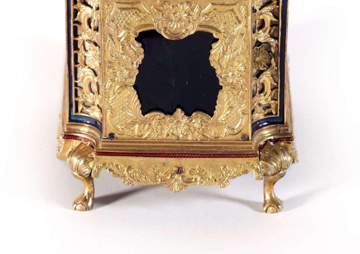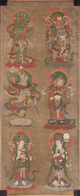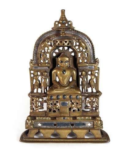 Inthelotusposition,onanaltarsupportedbytwomythologicalanimals,stands oneofthe24mastersofJainism(tirthankara).Athisside,therearefourother tirthankaras,twoseatedandtwostanding.Thefiguresarepiercedinmetalto enhancetheirthree-dimensionalityandenrichedwiththeinsertionofprecious silverfoils.Ontheback,ritualformulasandtheyearwhenthealtarwasoered tothetempleareengraved.