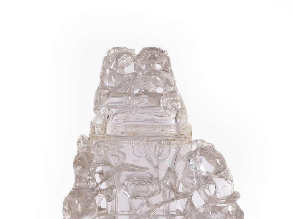 Finelycarvedintheshapeofabalustercolumnvasewithalidadorned withblossomingtreesandflowerswrappingaroundit,withlittlebirds perchedupon;itrestsonitswoodenbase.Totalweight:g88.