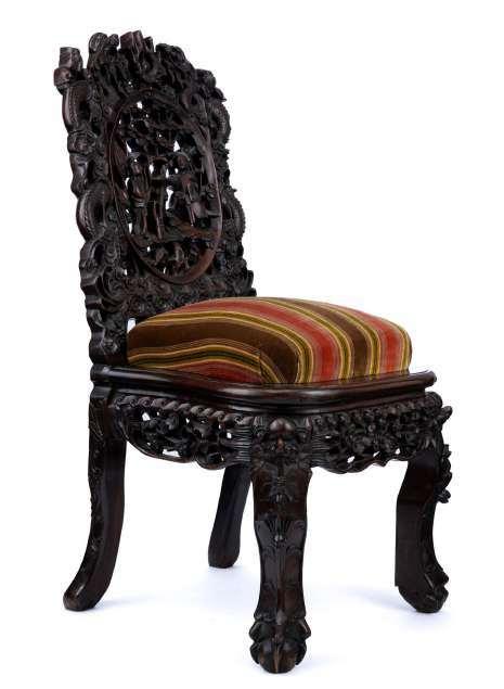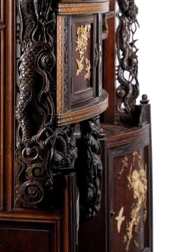 Inastylizedformofaforksupportedbytwobeautifullycarvedfull-roundlions, thetwoendsterminatewithanelephanthead;itiscoveredwithivorysheetsin a”snakeskin”pattern.