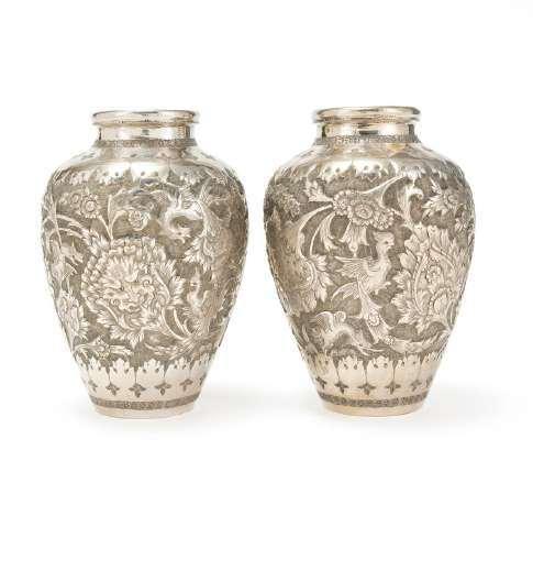 Acopperbasinwithtracesofengraveddecorationandinlays,andsilverplating,aglobular coppervasewithepigraphicandvegetalinlaydecorationincopperandsilver,apairof brassvaseswithelongatedpyriformbodiesandflaredrims,inlaidwithcopperandsilver anddecoratedwithelegantfoliatedmedallionsenrichedwithgeometricandpseudocalligraphicmotifs,andacopperboxwithsilverinlaydecorationfeaturingelegantfoliated andcalligraphicmotifs.