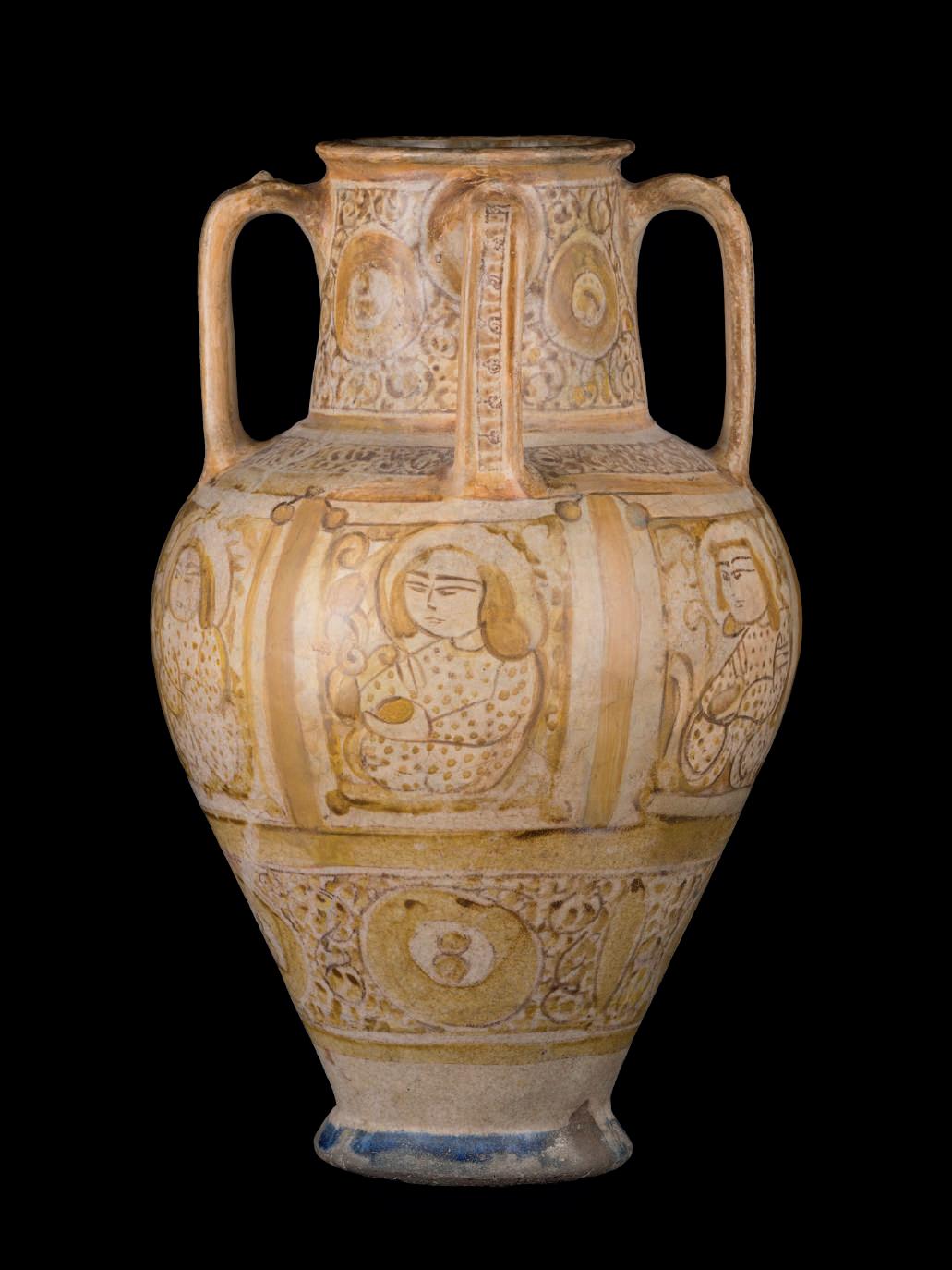 A rare example of four-handled fritware amphora decorated in a light brownish gold lustre, the foot painted in cobalt blue. The lower part of the body features a band with roundels containing stylised vegetable motifs against a background of vine scrolls. The upper part is divided into square panels framing seated figures on a vegetal background, the shoulder is adorned with further scrolling vines, and the exterior surface of the neck features the same roundels-on-vines motives encountered in the lower part of the body. The interior of the neck is painted in cobalt blue with a brown-lustre inscription in foliated Kufic. The four handles of the amphora are decorated with both epigraphic and pseudo-epigraphic motifs. Provenance: from a private Italian collection.