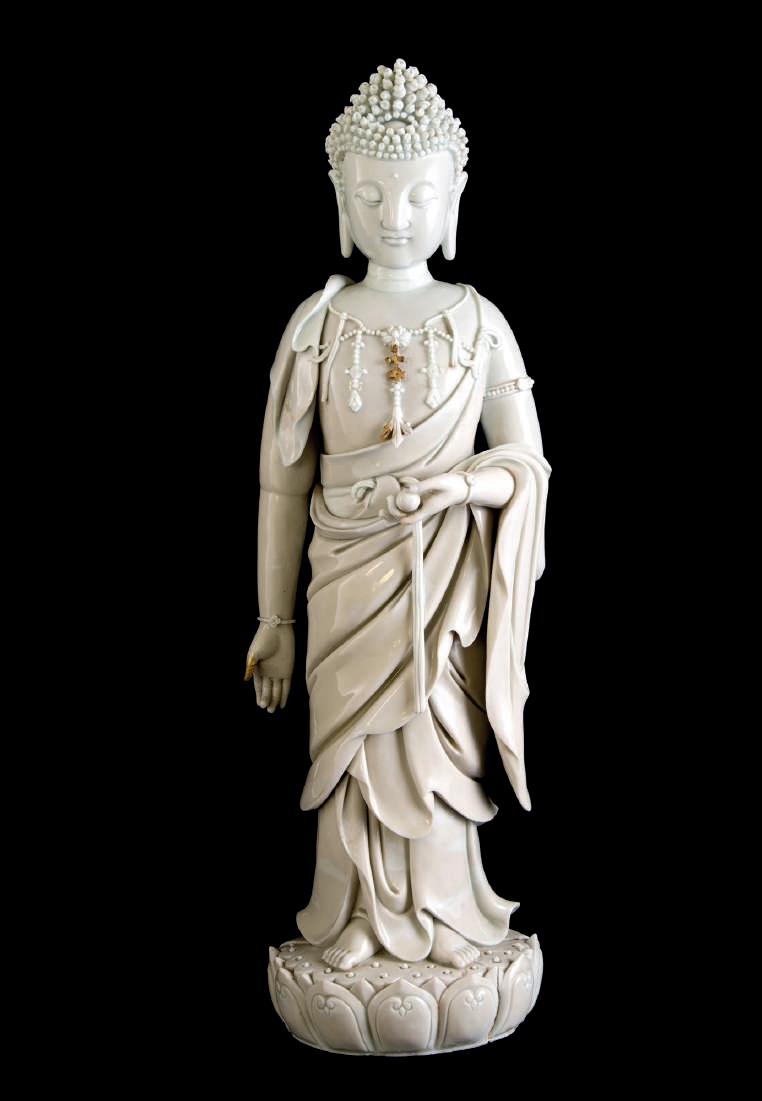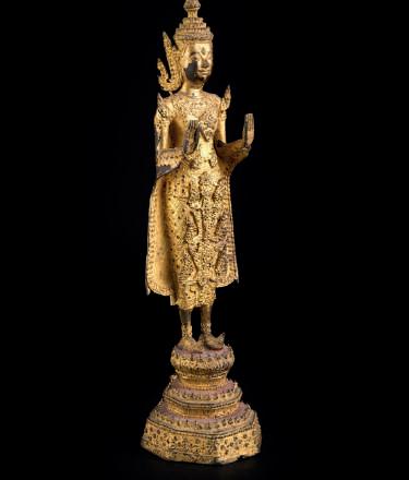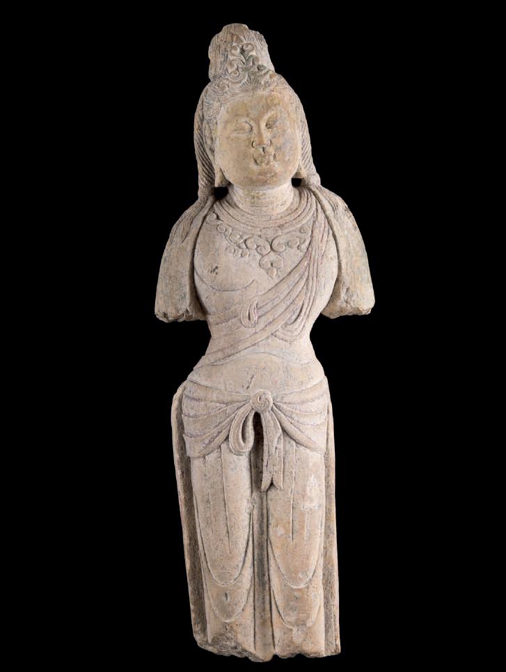 Maitreya has his right hand in the gesture of banishing fear and his left with the jar of the nectar of immortality. His bare chest is adorned with necklaces and prayer beads in the Iranian tradition. From the left shoulder descends a monastic cloak with ample drapery in the Hellenistic tradition. The eyes are half-closed and the face has an expression of deep spirituality. In the centre of the forehead protrudes a small mole, one of the somatic features that distinguish the Buddha and the bodhisattvas. The hair, held back by a string of pearls, is gathered into a chignon. The body is well modelled and the interlacing of the monastic cloak with the tight robe on the hips accentuates the volumes and creates an effect of movement. The head is framed by a broad halo, a symbol of the spiritual light radiating from the bodhisattva. Lot with Certificato of importation: N. 419