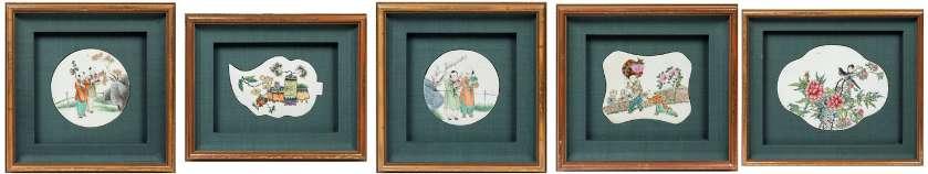 Four decorated in underglaze blue with flowers and animals; one monochrome covered with a brown glaze.