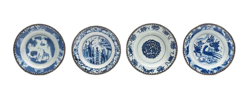 Quattro decorate in blu sotto coperta con fiori e animali, una monocroma ricoperta da uno smalto marrone.
