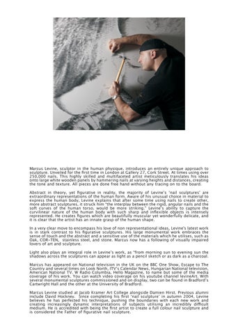 MarcusLevine,sculptorinthehumanphysique,introducesanentirelyuniqueapproachto sculpture.UnveiledforthefirsttimeinLondonatGallery27,CorkStreet.Attimesusingover 250,000nails.Thishighlyskilledandmultifacetedartistmeticulouslytranslateshisideas ontolargewhitewoodenpanelsbyhammeringnailsatvaryingheightsanddistances,creating thetoneandtexture.Allpiecesaredonefreehandwithoutanytracingontotheboard.