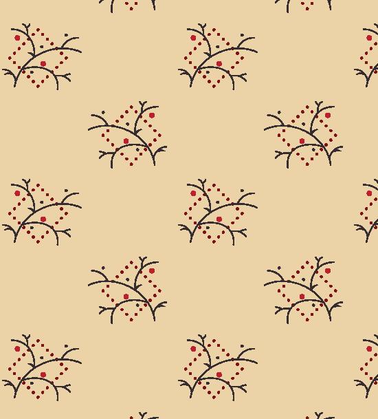 Missie Carpenter of Traditional Primitives debut collection! Although inspired by an antique French fabric, her changes to the color palette gives it an updated appeal. She suggests the use of the diamond shapes in the main design for fussy-cut appliqué and Broderie Perse projects, some of her favorite types of projects.
