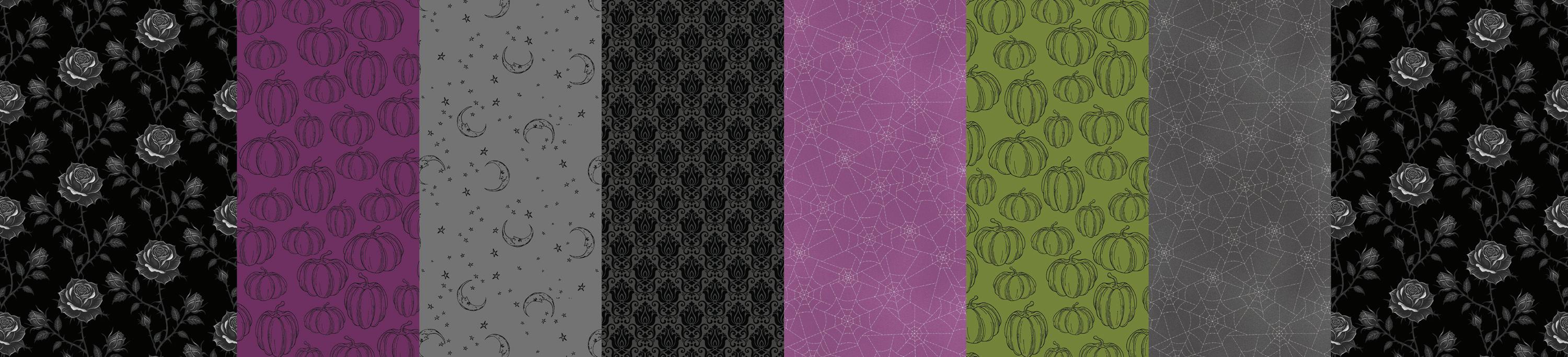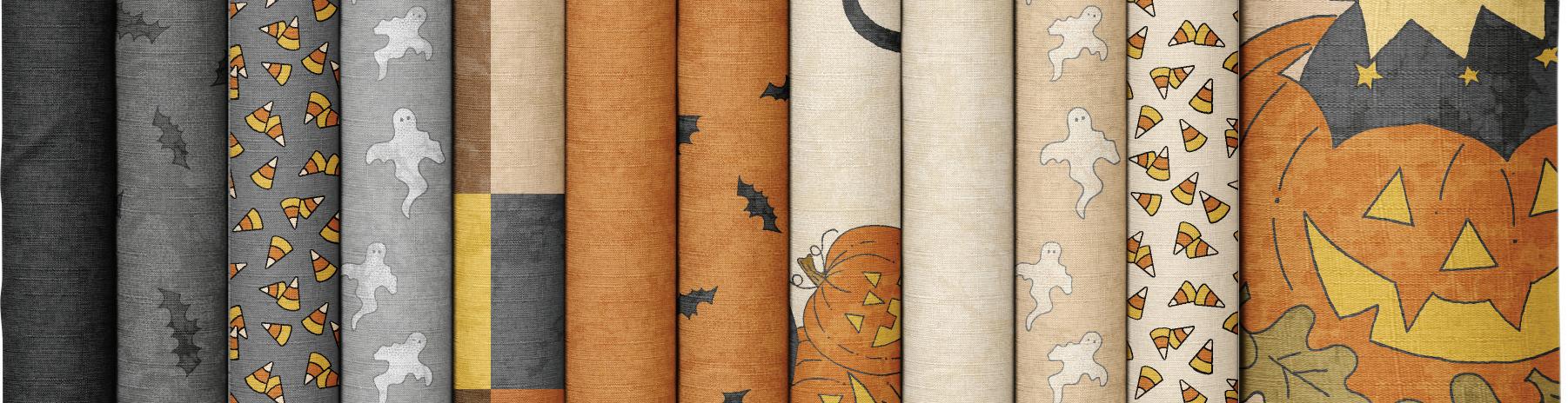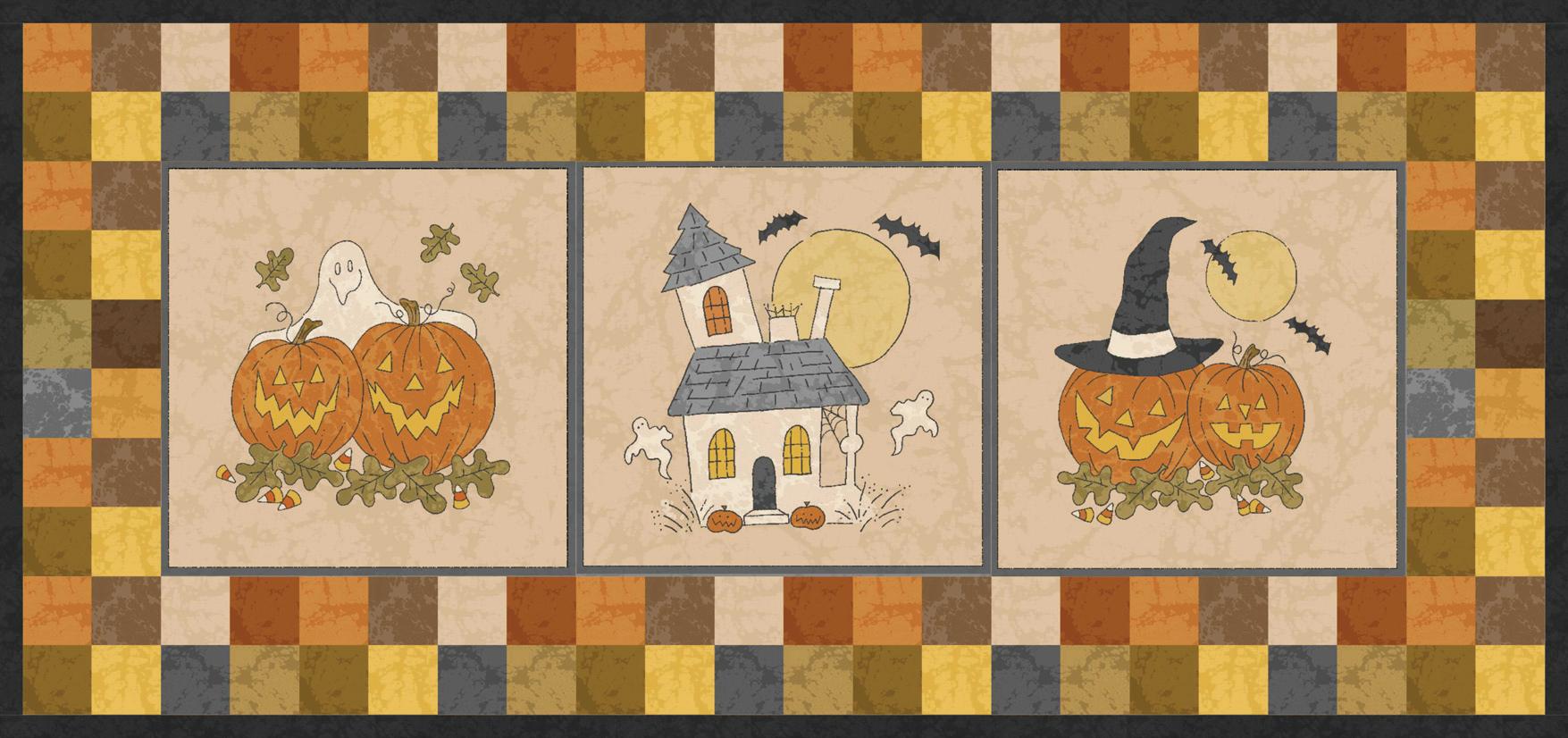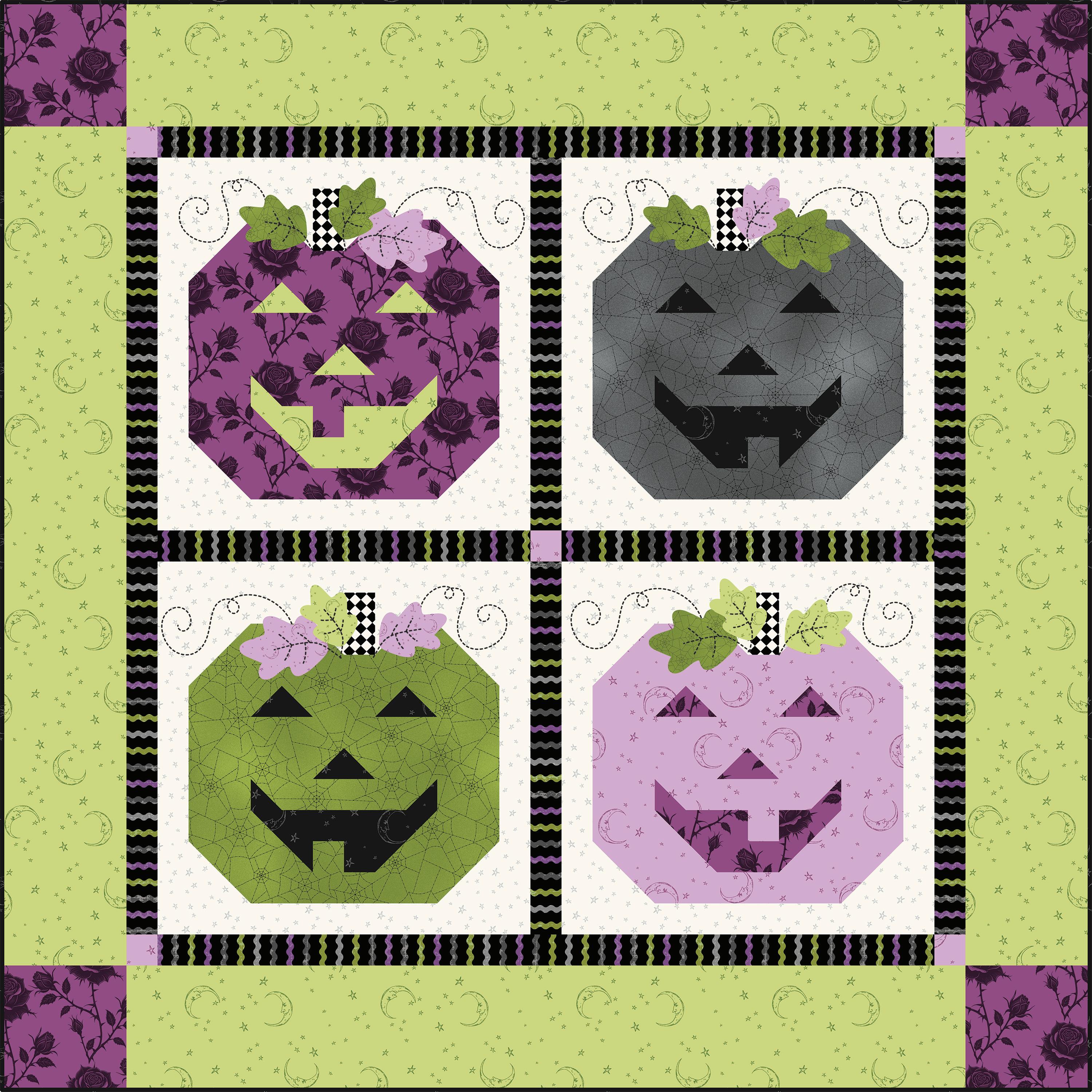 Cindy Staub presents her “favorite fabric line so far. I am a Halloween fanatic and start watching my spooky movie favorites as soon as there is a chill in the air. I remember as a child there being an old, abandoned house near the school yard (there’s one in every town!) and I imagined a few ghosts lurking about it. Now, as a family, we take time to carve pumpkins for Halloween and now my granddaughters join in on the fun.”
