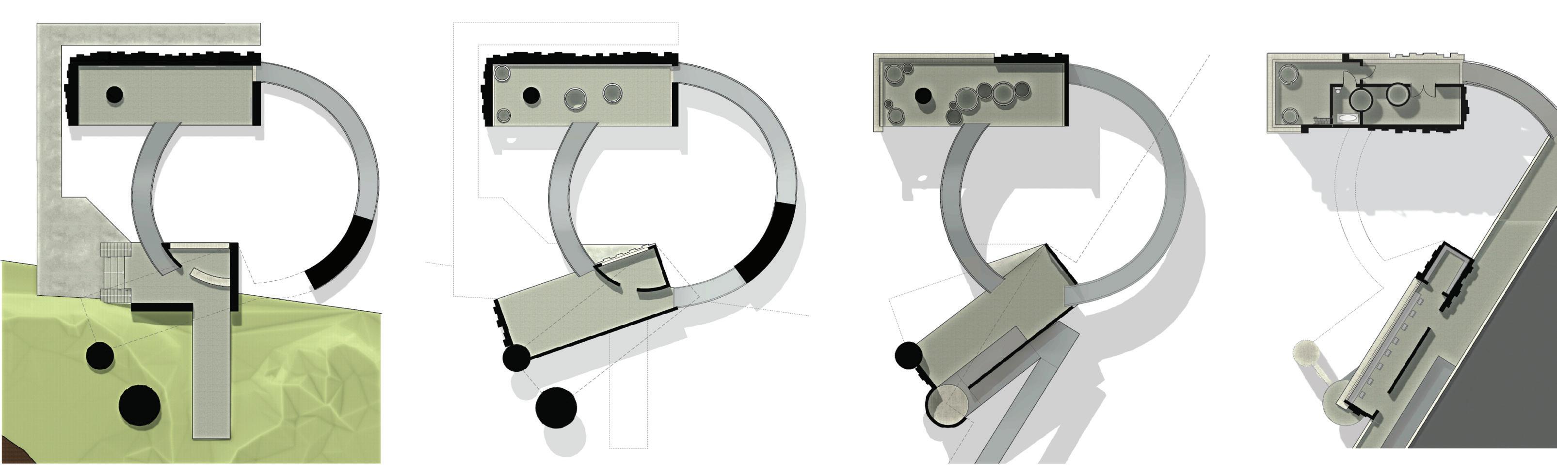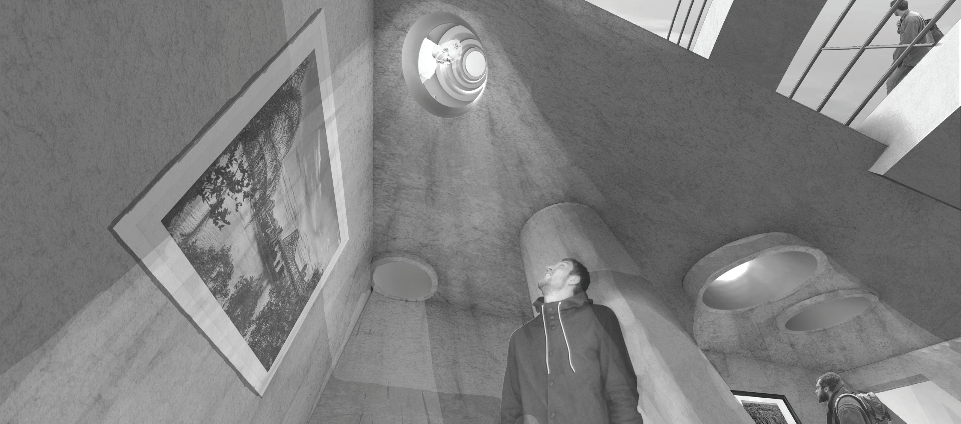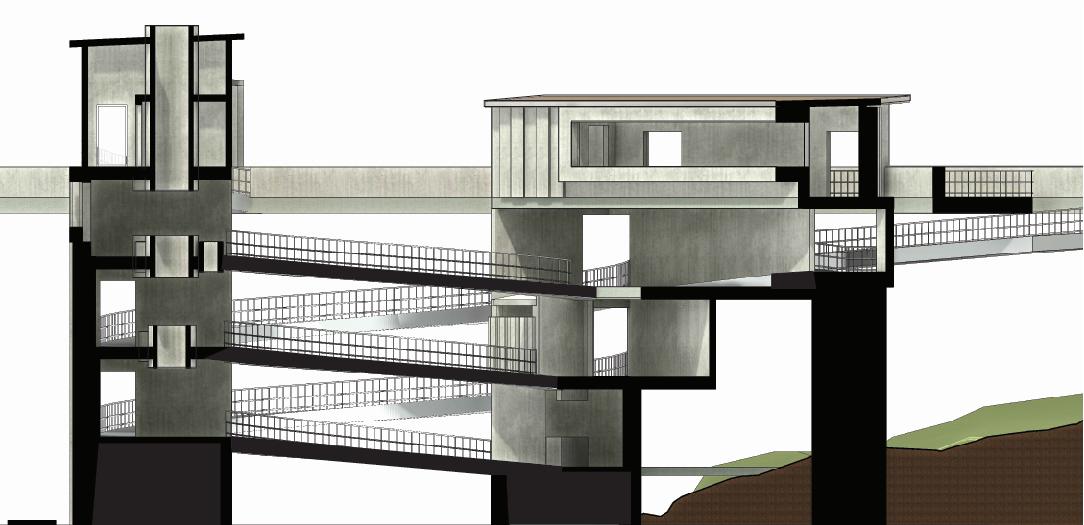 The connection between the bridge and the river lies at the core of the design philosophy. The aim is to change this portion of the campus from a zone of transportation to a point of interest. The system of circular ramps downward emulates the downwards directionality of water, furthering the connection of visitors with the river. The ramp system guides visitors to constantly cross the river that travels through the gallery, educating and binding the experience to the water.