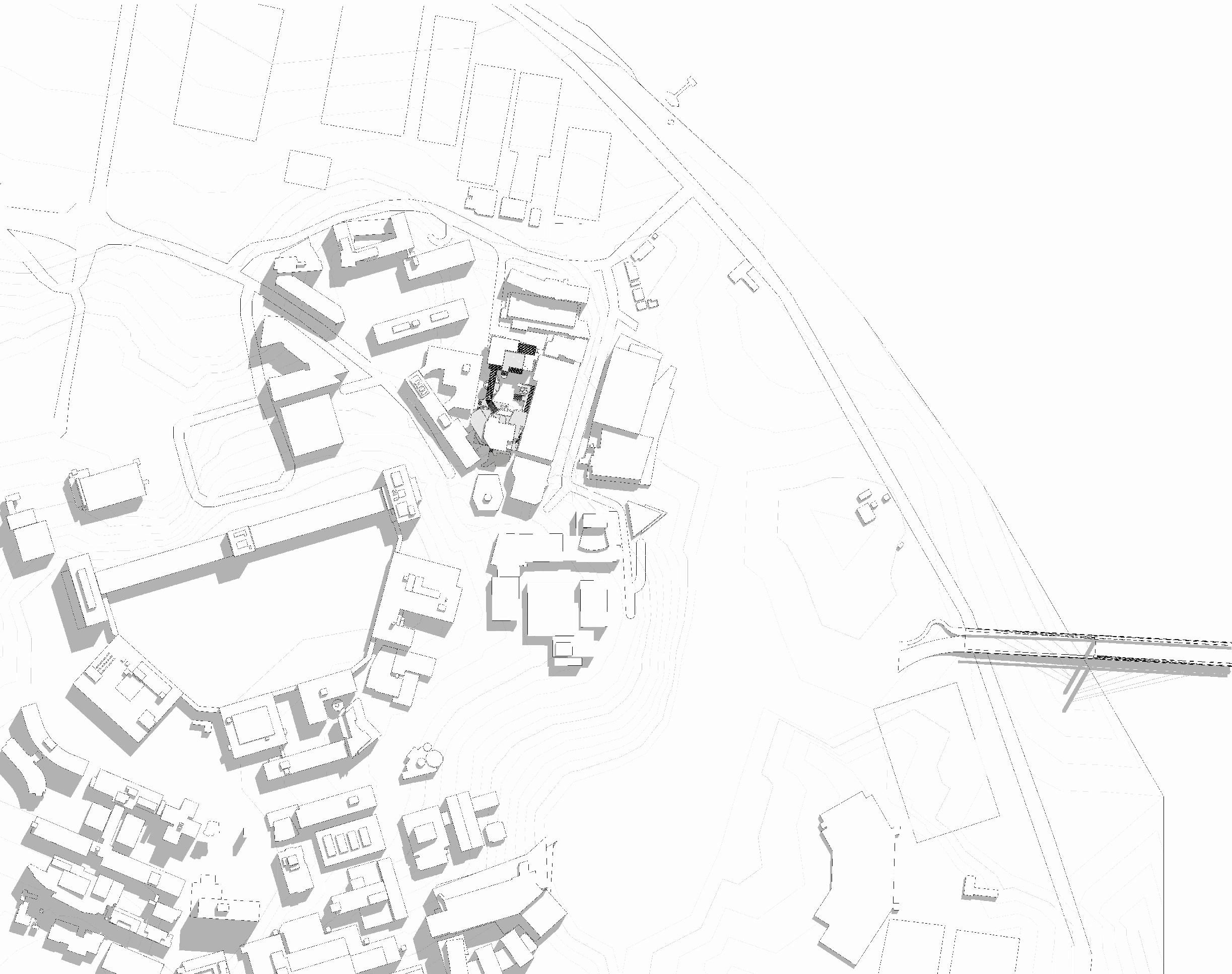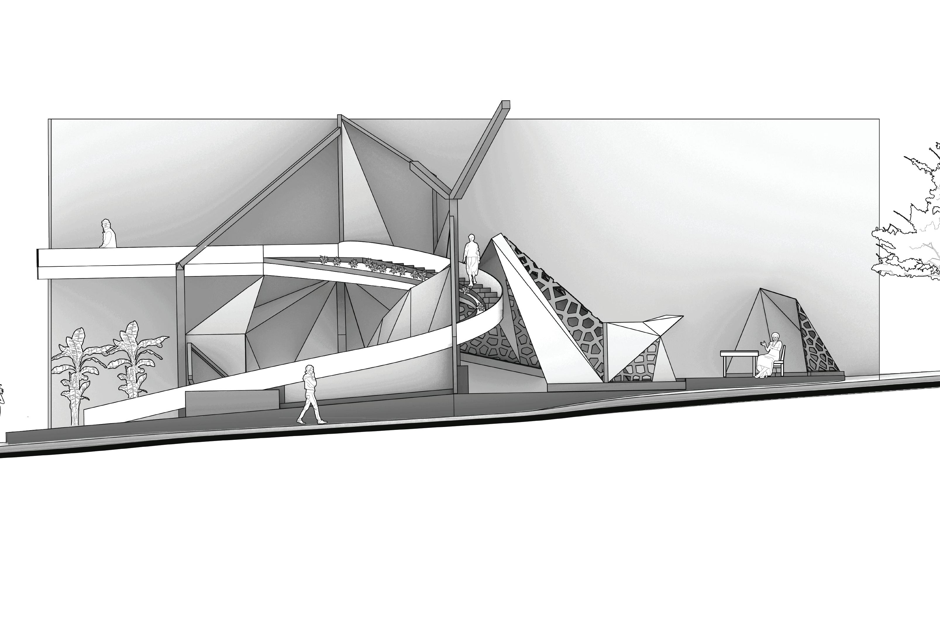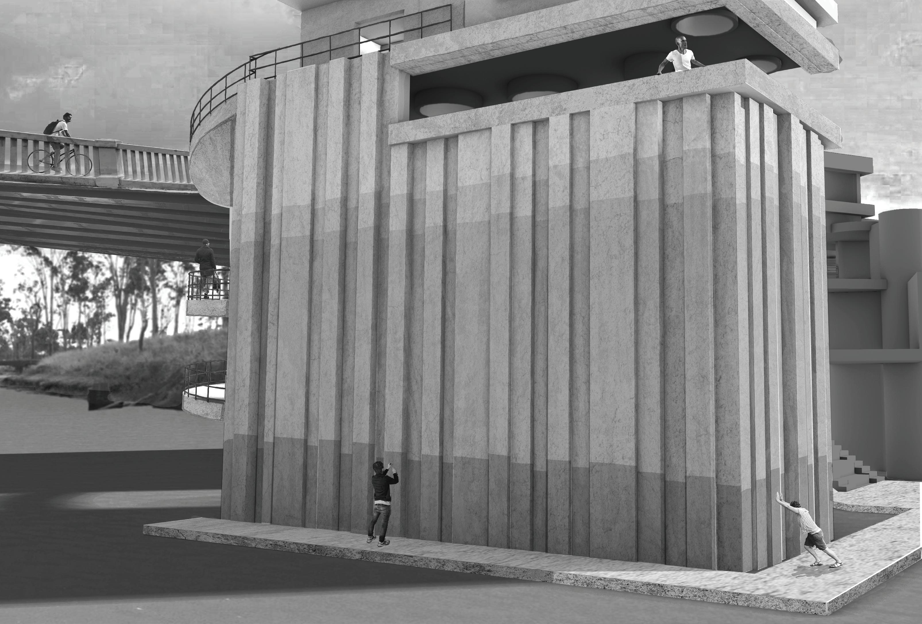The connection between the bridge and the river lies at the core of the design philosophy. The aim is to change this portion of the campus from a zone of transportation to a point of interest. The system of circular ramps downward emulates the downwards directionality of water, furthering the connection of visitors with the river. The ramp system guides visitors to constantly cross the river that travels through the gallery, educating and binding the experience to the water.