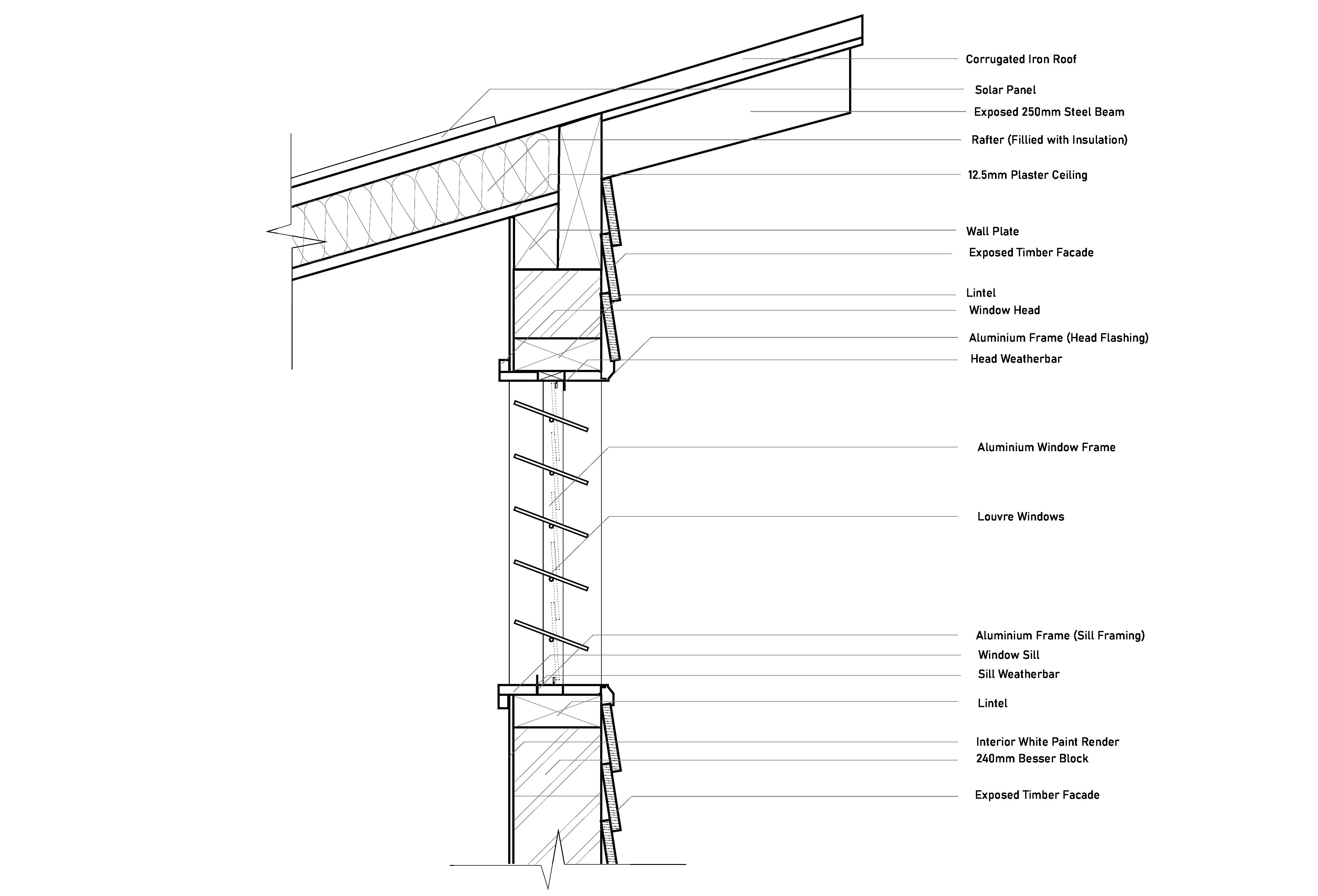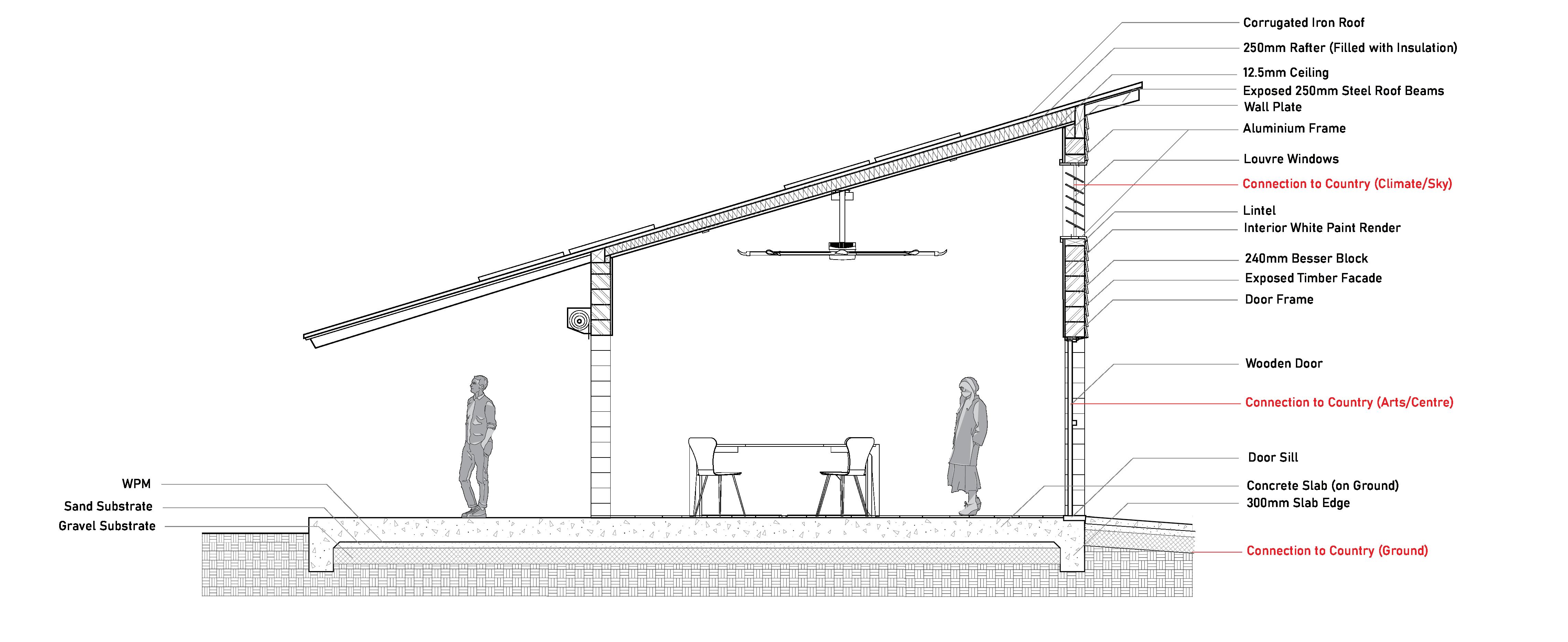 A harsh tropical climate, as well as the constraints of the limited electrical grid in the township of Gununa made passive design and climatic factors a major design consideration. This was investigated through detailing, particularly in the artist studios that are not air conditioned. Natural ventilation, shading overhangs, material choices and construction techniques as well as utilisation of renewable energy technology were all considered and communicated through detail studies.
