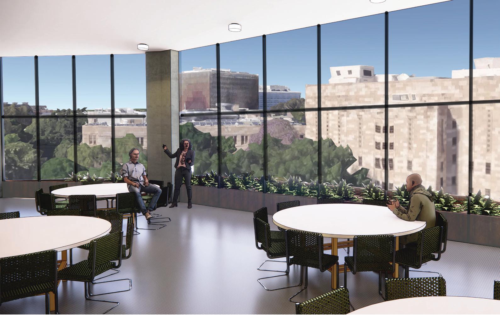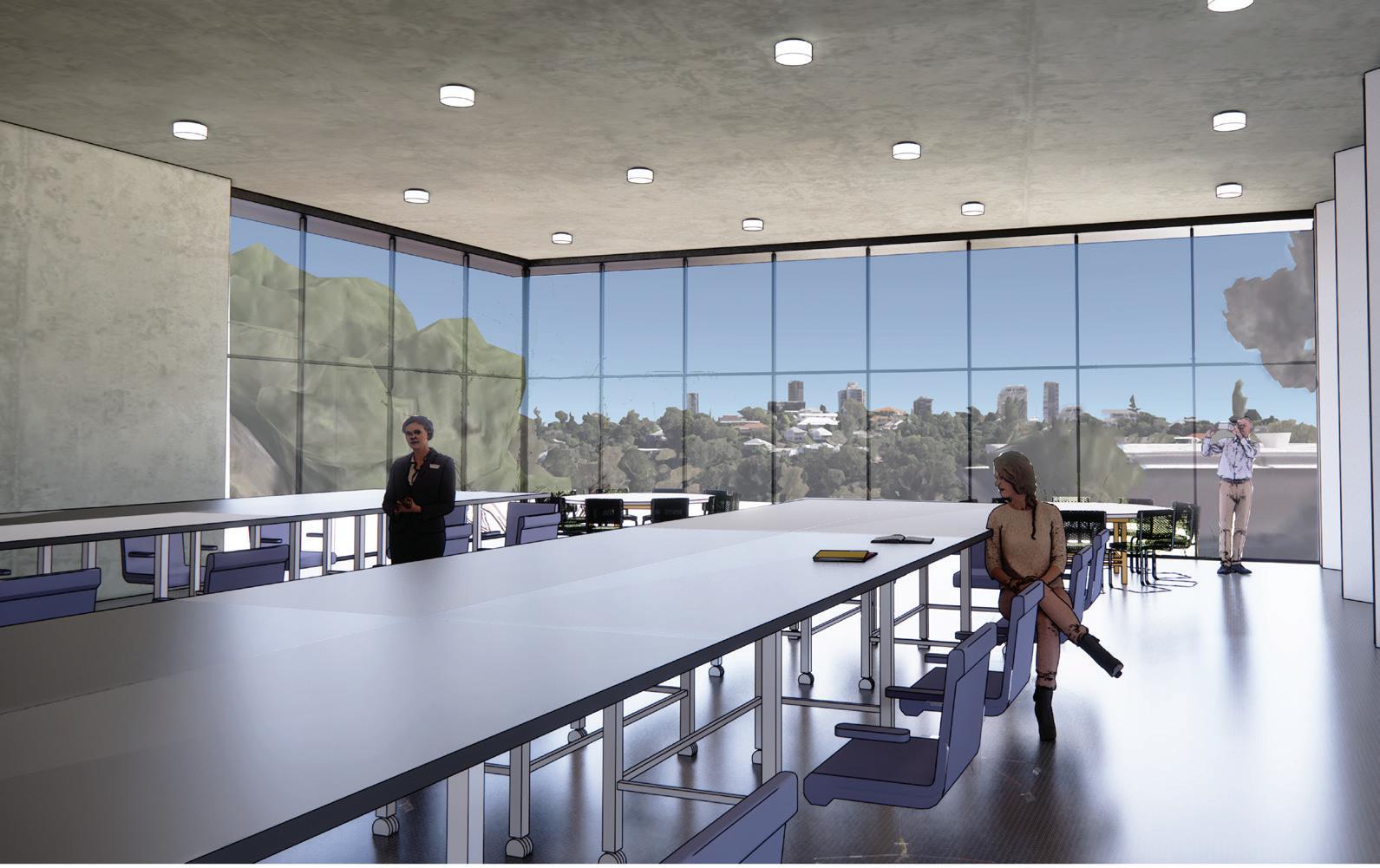 The goal for the proposed new School of Architecture is to create a learning environment which, rather than being an insular private experience, opens the students up to the archi tecture and environment of the city around them. By taking advantage of the height of the towers and specific geometry of the floorplates as the two distinct towers ascend, views of the city skyline, the river and UQ’s famous sandstone Great Court are framed in the learning spaces.