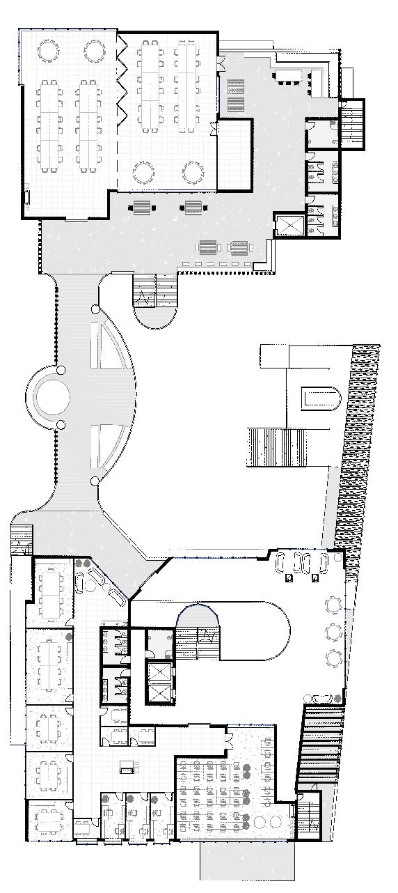 At the core of the proposed new School of Architecture is the idea of students achieving growth and development as they ascend the building. This is represented by the circular podium levels, signifying the trunk of a tree, housing the first- and second-year students.