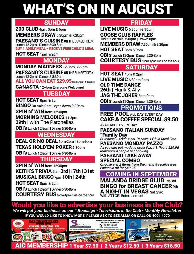 The Express, Wednesday, August 2, 2023 PAGE 3 www.theexpressnewspaper.com.au 4091 5388 www.tablelandslaw.com.au Let us show you how... Contact Anne English today! Not worth the paper it’s written on? Sorry, think again, you could be very surprised. Let us show you why! Passenger, SUV & 4WD Tyres Latest wheel alignment equipment & mechanical services at all branches. NOBODY BEATS OUR 4 STORE BUYING POWER MAREEBA 4092 2290 ATHERTON 4091 1122 MALANDA 4096 5300 MOSSMAN 4098 1502 BUY A FULL SET OF TYRES AND GET A FREE ROTATE, BALANCE & PUNCTURE REPAIR FOR THE LIFE OF THE TYRES! TABLELAND DISTRIBUTOR FOR: SIMON’S VEHICLE HIRE Phone 4091 2739 or Mobile 0419 700 109 Offering Free Atherton/Tolga Pick Ups! 21 Comet Avenue, Atherton (Behind Harvey Norman) NEED TO PROTECT YOUR PRIDE AND JOY? TALK TO YOUR LOCAL BUILDER! Contact your local builder sales@dunnritemareeba.com.au 4092 7668 M & S France Pty Ltd QBCC 15408840