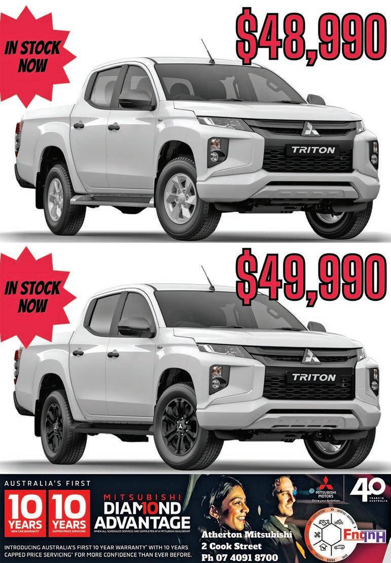PAGE 40 The Express, Wednesday, September 6, 2023 www.theexpressnewspaper.com.au John Cole Isuzu UTE 7813 Kennedy Highway Atherton,QLD 4883 07 4030 5590 johncoleisuzuute.com.au DRIVE AWAY * $ 68,732 D-MAX LS-U + 4X4 AUTO DRIVE AWAY * $ 65,990 MU-X LS-T 4X4 AUTO DRIVE AWAY * $ 64,990 D-MAX X-TERRAIN 4X4 MANUAL NOW AVAILABLE AT ATHERTON NISSAN John Cole Toyota Atherton 7813 Kennedy Highway Atherton QLD 4883 T: (07) 4030 5555 1003115 johncoletoyota.com.au Innisfail 25-29 Palmerston Drive Innisfail QLD 4860 T: (00) 4043 8555 1003115 johncoletoyota.com.au T&Cs Apply See instore for details. Atherton Nissan cnr Vernon & Louise St Atherton,QLD 4883 07 4030 5400 athertonnissan.com.au *Terms and conditions apply. 5.9% Comparison rate for approved personal applicants of Nissan Financial Services (Australian Credit Licence Number 391464) (NFS). 5.9% APR. Maximum 48 month term. WARNING: This comparison rate is true only for the example given and may not include all fees and charges. Di erent terms, fees or other loan amounts might result in a di erent comparison rate. This comparison rate for the purpose of the National Credit Code is based on a 5 year secured loan of $30,000, although this o er relates to a 48 month term only. Under the Nissan Future Value (NFV) program, you can return the vehicle back to NFS for the pre-agreed future value (adjusted for excess kilometres and the cost of repairs for vehicle damage beyond fair wear and tear), to pay the nal balloon payment on your loan. Allowed kilometres and vehicle condition requirements are set out in the NFV agreement. O er available on new and demonstrator MY23 ST, ST+ and ST-L QASHQAI vehicles (excluding demonstrators over 5,000km or 6 months from registration) purchased by 31/08/2023. Excludes Government, Rental and National Fleet customers. For more information see Nissan.com.au/NissanFutureValue. Nissan reserves the right to vary, extend or withdraw this o er. Not available in conjunction with any other o er. ~See Nissan.com.au/warranty and Nissan.com.au/roadsideassistance for T&Cs. Andrew Ford: 0417 633 002 | Claude Formoso: 0477 229 949 | Drew McKenzie: 0400 068 700 279 Byrnes St, Mareeba | 4092 9400 | www.hansenford.com.au Hansen Ford QUALITY USED CARS Prices include government transfers, stamp duty and registration. 2022 Ford Escape SUV 8 speed auto, company loan vehicle, power lift tailgate, balance 5 year warranty only 4200 klms. $37,990 2022 Mitsubishi Outlander Exceed AWD 7 seater wagon, only 5700km’s, balance new car warranty to Jan 2030, great value! $50,990 2016 Mazda CX-9 Azami AWD 7 seater wagon, one owner, tow bar, full range of standard features, 12 months warranty. $33,990 2017 Prado GXL Wagon Comp Jan 18, turbo diesel auto, 6 months rego, 12 months warranty, tow bar, tinting. $55,990 2018 Mitsubishi Triton GLX Plus 4x4 dual cab turbo diesel, automatic, tow bar, side steps, 12 months warranty. $34,990 2015 Hilux SR 4x4 Dual Cab 3.0 litre turbo diesel, automatic, 104,000 klms, canopy, tow bar, 12 months warranty. $36,990