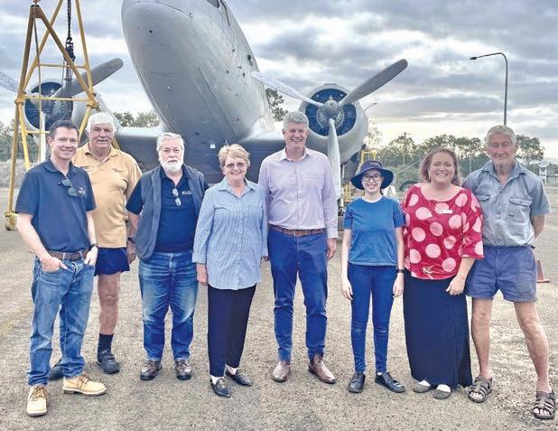 Pictured in front of C-47 Dakota aircraft (from left) are FNQAM president Brendan Kent, volunteers John Hardy, Andy Smith and Joan Stanton, Tourism Minister Stirling Hinchcliffe, student volunteer Teresa, Mareeba Shire’s Local Tourism Organisation chair Cr Lenore Wyatt, and volunteer Charlie Jennings.