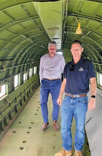 RIGHT: President Brendan Kent and in the Tourism Minister Stirling Hinchcliffe inside the restored C-47 Dakota aircraft.