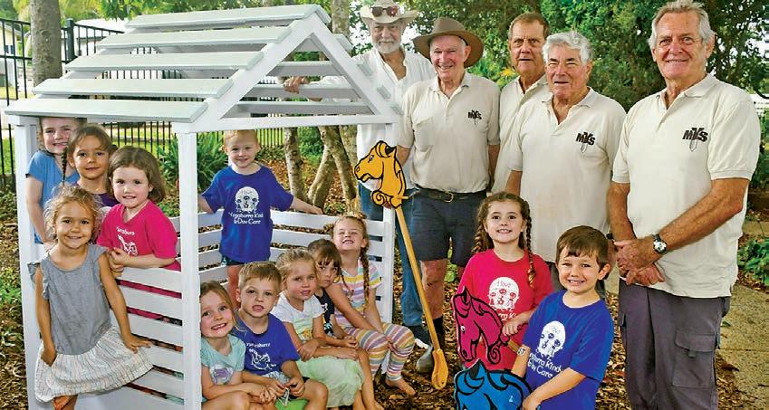 PICTURED: Members of the Yungaburra Men’s Shed delivered a handmade cubby house and some hobby horses to children at the local kindergarten.