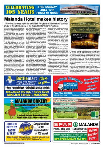 105 YEARS Malanda Hotel makes history The iconic Malanda Hotel will celebrate 105 years in Malanda this Sunday. Below is the steep history of the largest timber hotel in Australia. PATRICK English was the first licensed victualler for the Malanda Hotel which was opened on Saturday July 8, 1911, in the grand ballroom. The following day saw the official opening of the railway and a special excursion train arrived. The train arrived at Malanda at 1.30pm, where ninety people travelled on the train and along with the locals from the area, it was a full house for the new hotel. On the September 6, 1911, two months after the opening, the license was transferred to Catherine English, Patrick's mother. The English family decided to move from the farm house on portion 39 to live at the hotel. The Malanda Hotel, now completely finished staged their official opening on Boxing Day 1911. The hotel was packed out and a sports meeting, including woodchops was held on Malanda's unmade street in front. At night, the balcony of the hotel was a dance floor. It was a huge event and everyone in the area attended. The hotel was a wooden building, with twelve bedrooms on the top floor, a bar section, dining room, store room, cellar and kitchen on the ground floor. Stables for the horses were provided at the back of the buildings. With the men in the English family busy working, much of the running of the hotel was left to Catherine and her two daughters Mary and Elizabeth, who