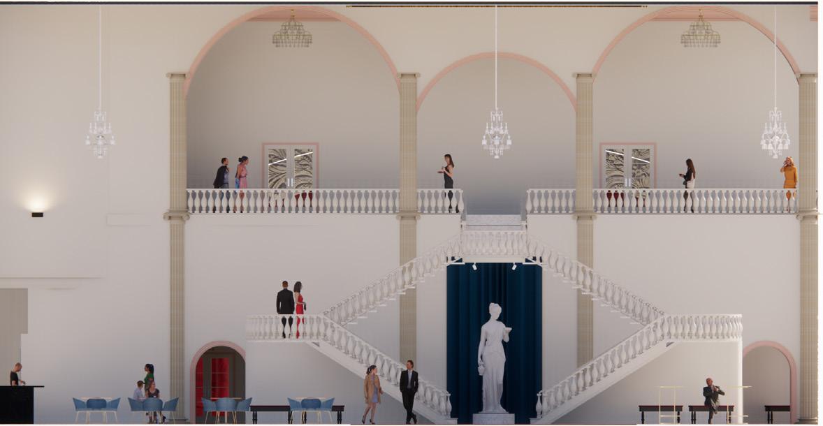 Architectural lighting accentuates the historic nature of the building while decorative chandeliers provide ambient lighting that supports the classical mood of the space.