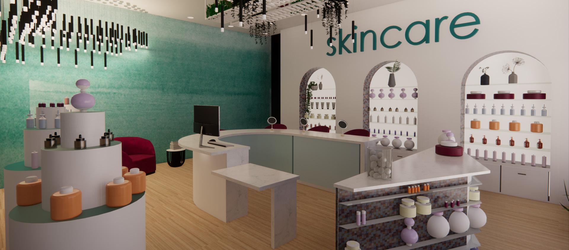 This clean, reflective retail space offers rejuvenating products and confidence to its customers. The valiant teals, pops of pink, and neutral tones and elements mimic the sophisticated energy of Chanel. Natural greenery and textures direct the eye throughout the space and offer a sense of familiarity against the bold colors and reflective light.