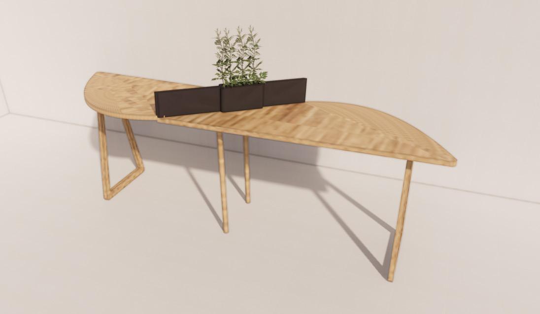 Detatchable Plant Holder w/ Power A-Frame Legs Transparent Resin Top Pull-Apart Flexibility Organic Wood Element Seat Cushion for Comfort Body Contour Backrest A-Frame Legs Seat Cushion for Comfort Stackable Combined legs and arm rests Retractable Whiteboard Acoustic Material Grid for Flexible Shelf Rearranging Biophilic Wood